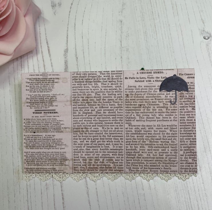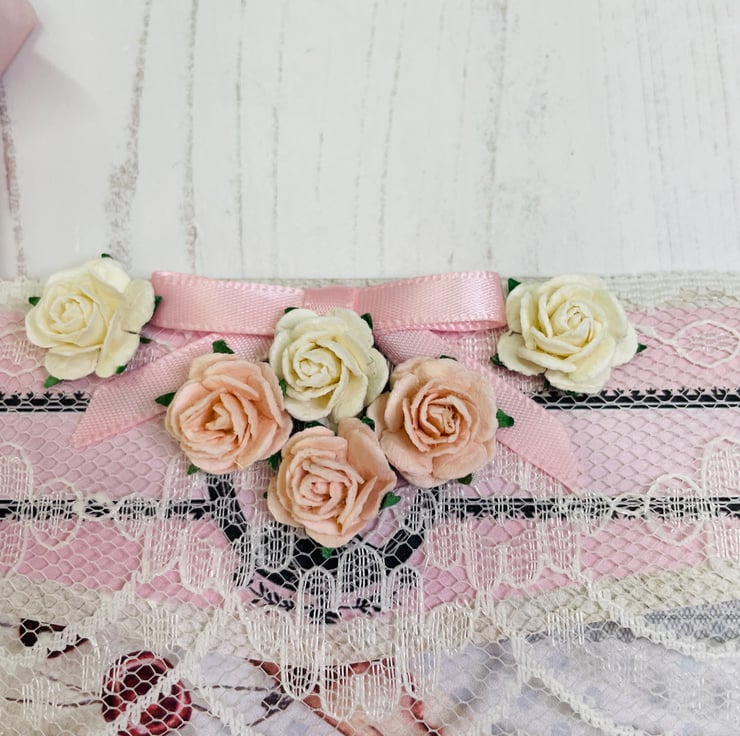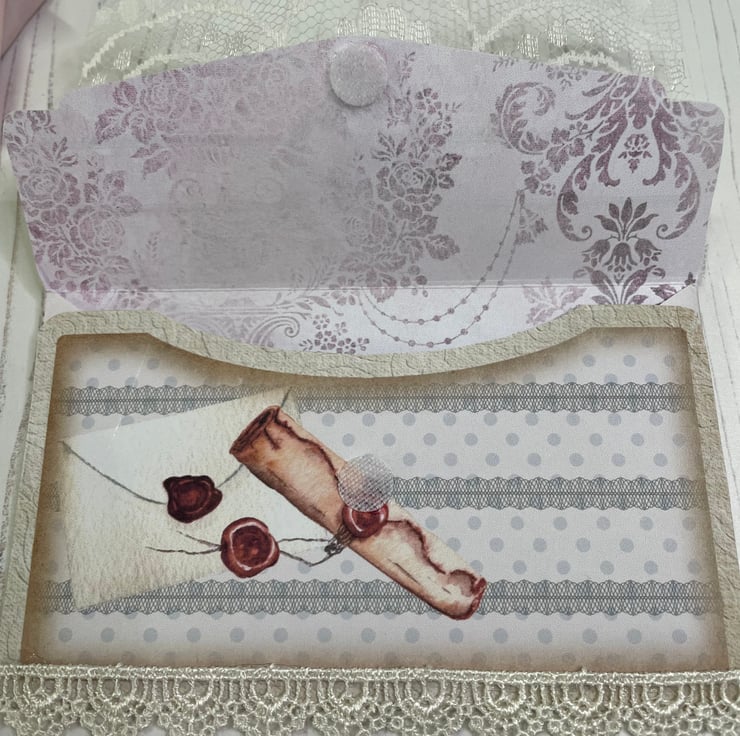 Cash is an awkward but easy gift to give. Something that needs a special envelope for presentation. Decorated with lace and paper roses. A pretty way to gift cash. Measures Box 5.5/8” x 3.75” x 3/4”. Envelope 5.25” x 3.25”.