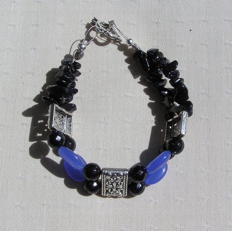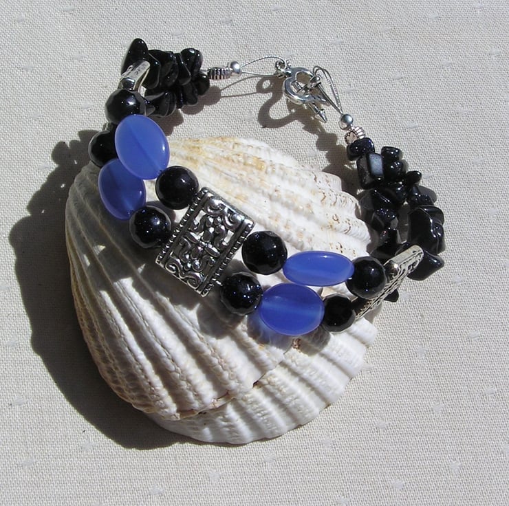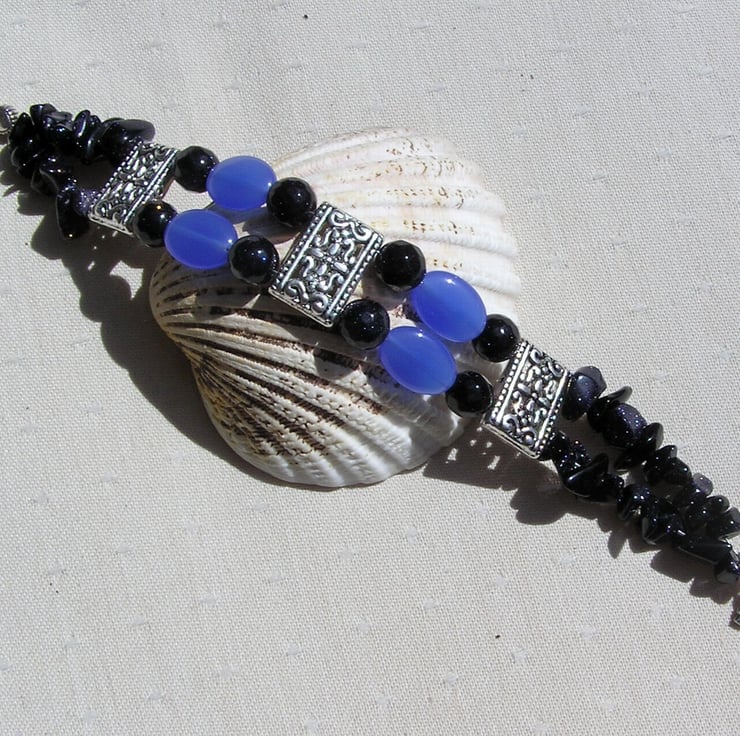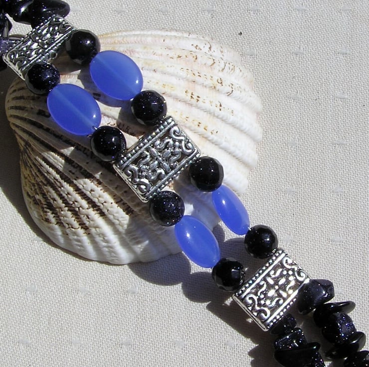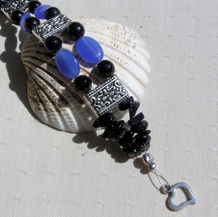 This Stunning Bracelet is made from Blue Jade Oval Beads teamed with Blue Goldstone... round beads & Gem-chips each section separated by an ornately decorated Tibetan Silver Bar Spacer with a tiny Silver Heart at each end - a Beautiful Regal effect that will look stunning either worn casually or with something more Elegant for a Special Evening out