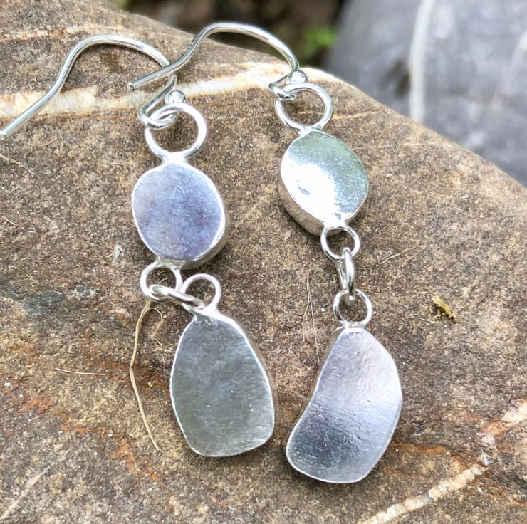 Each piece has been set in a fine silver bezel (.999) and attached to a sterling silver (.925) hook drop earring setting.