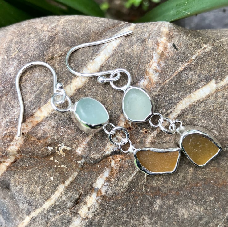 These beautiful pieces of pale aqua and honey sea glass were found along the UK's South West coastline and have been handpicked and paired together to make a unique pair of earrings.