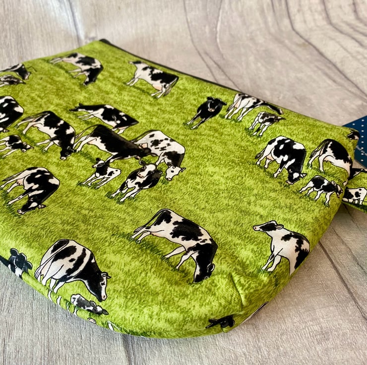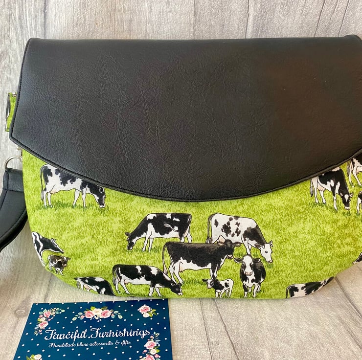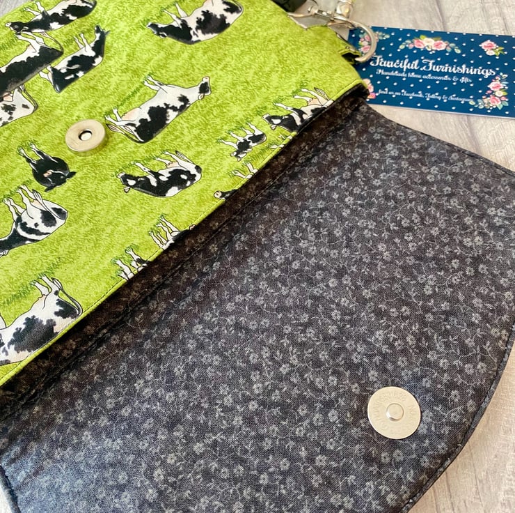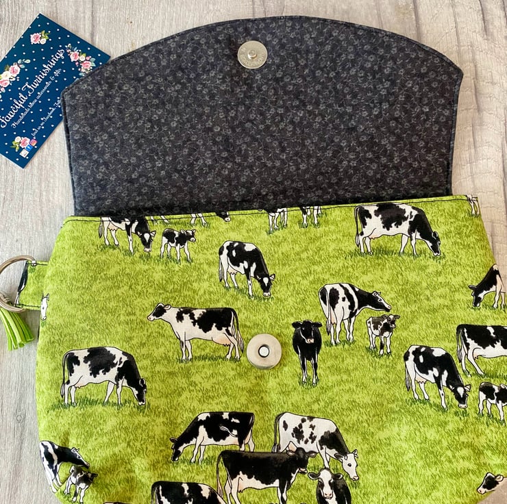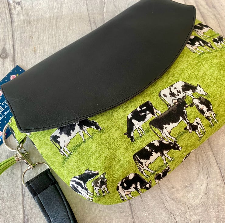 Handmade soft fabric clutch bag with matching fabric wristlet strap. Gorgeous floral fabric teamed with faux leather on the flap and strap. Fully lined and interfaced with fusible fleece to give a slightly padded feel. Measures approximately 8.5” x 7.5”.