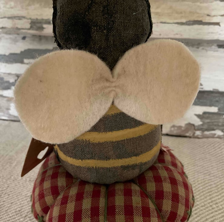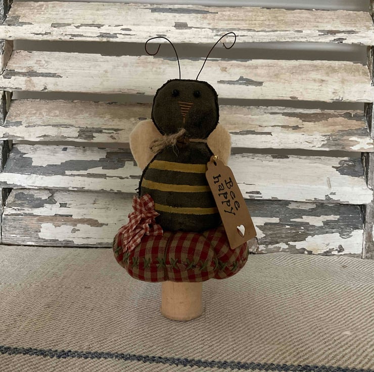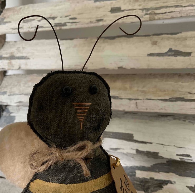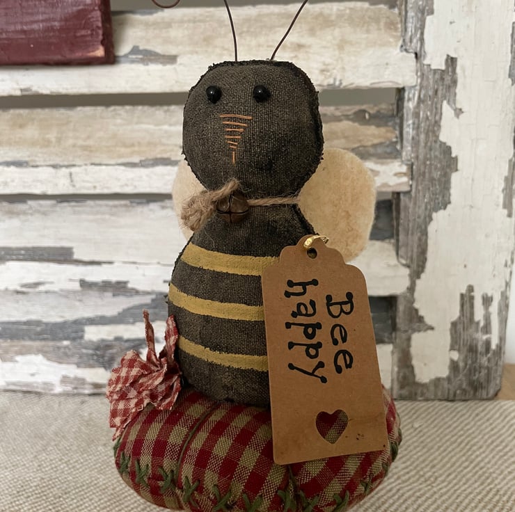 A charming primitive handmade bumble bee pin cushion on a vintage wooden spool, he has felt wings and rusty wire antennas with a rusty tin bell. He measures approximately 22cm tall