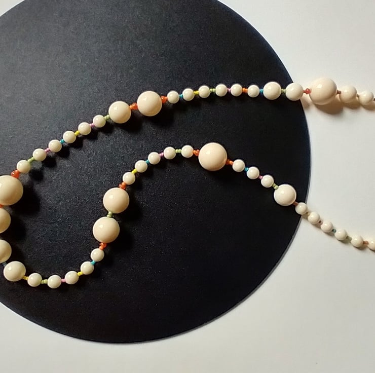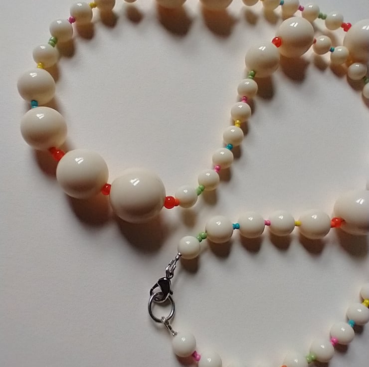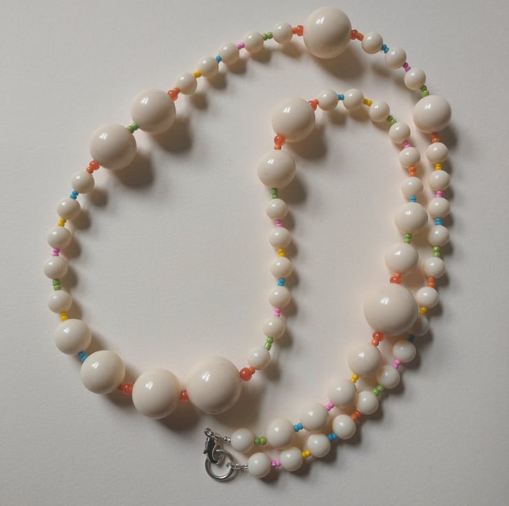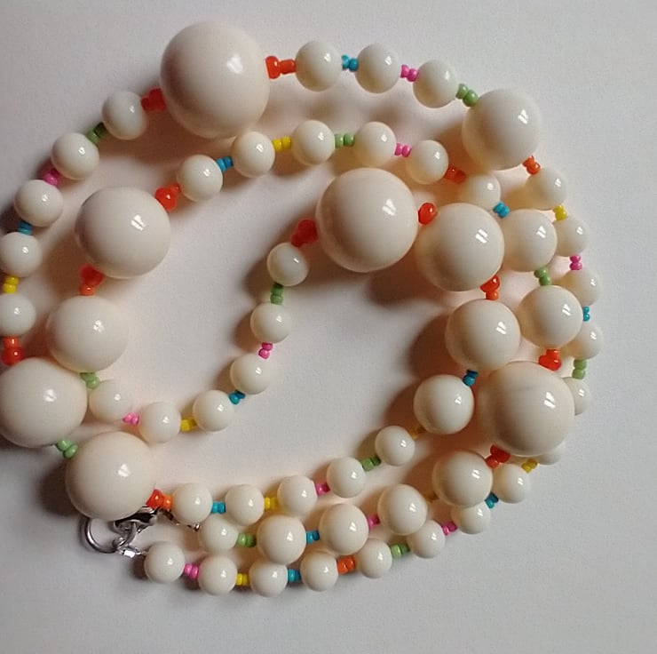 Bold long necklace with differing sizes of cream upcycled beads which have been restrung with a tiny colour pop of glass seed beads in between, in shades of yellow, pink, turquoise, lime and orange. This necklace looks great against a dark background. Funky and fun!