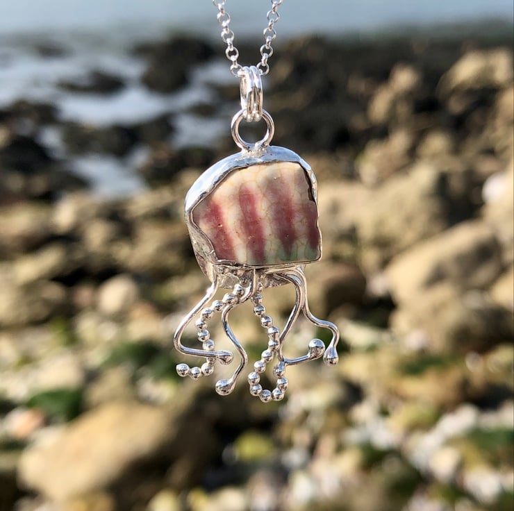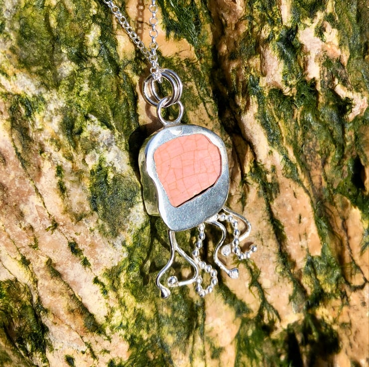 This unique piece of double sided pink sea pottery was found along the UK's South West coastline and has been set in a fine silver bezel (.999) and using recycled (ecosilver) sterling silver wire (.925) to create a beautifully unique Jelly fish pendant. The back of the pendant has been left open so that the unique piece of pottery shows both sides.