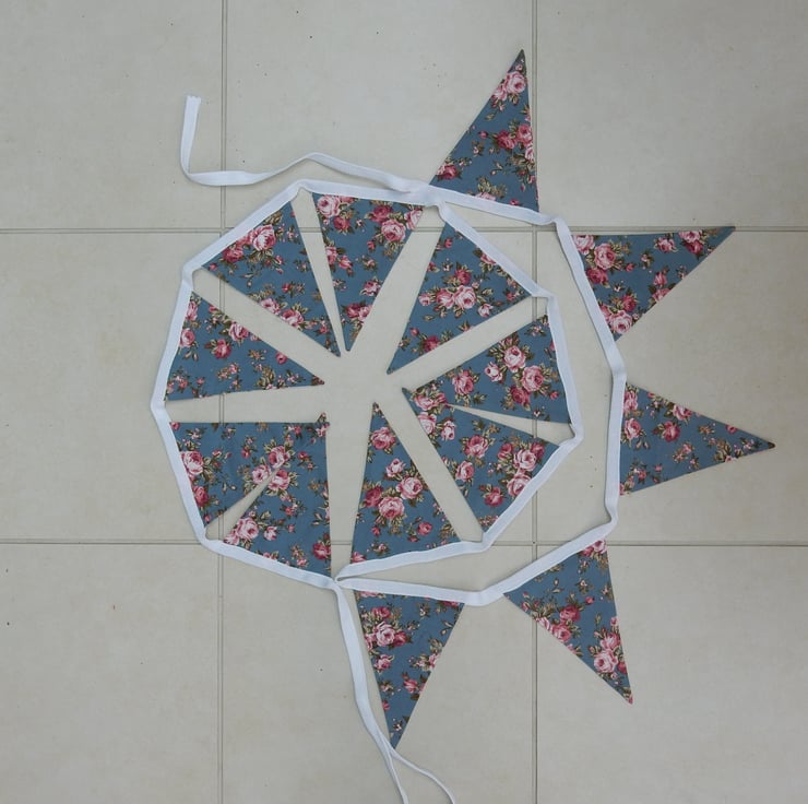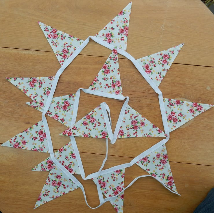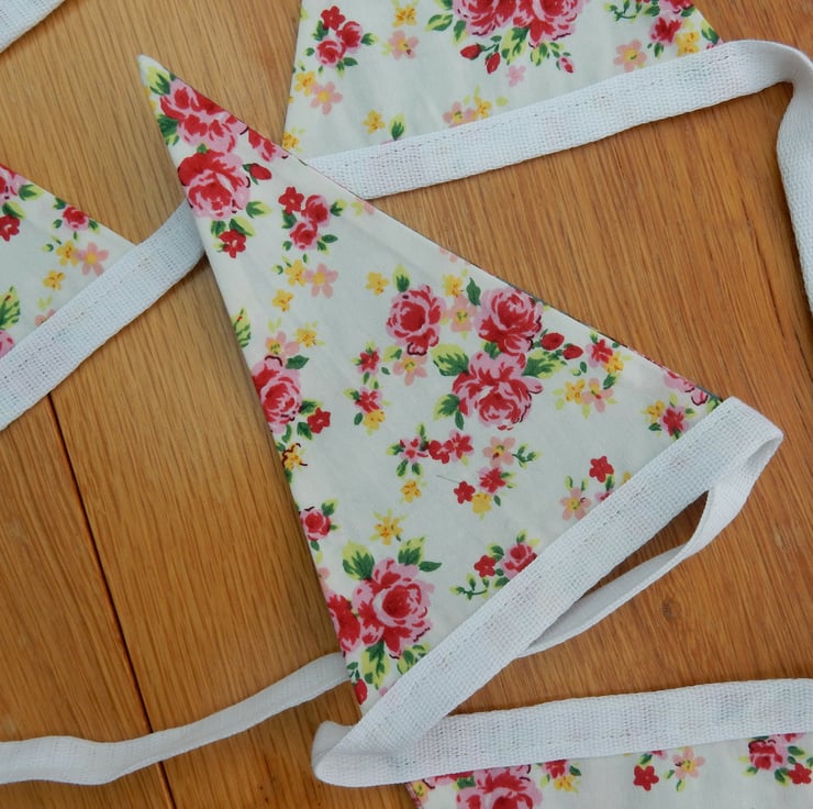 This stunning chintz effect floral bunting is fully reversible, so two for the price of one. There are two different fabrics on the front and back for a change of look or for a double sided effect in a window or similar. The white tape measures 2.5 metres total, with the measurement from first to last flag being approx. 180cm (70 inches). This gives a generous length of bunting, with ties at each end for hanging. Each of the 14 flags is 16cm (6.5 inches) deep.