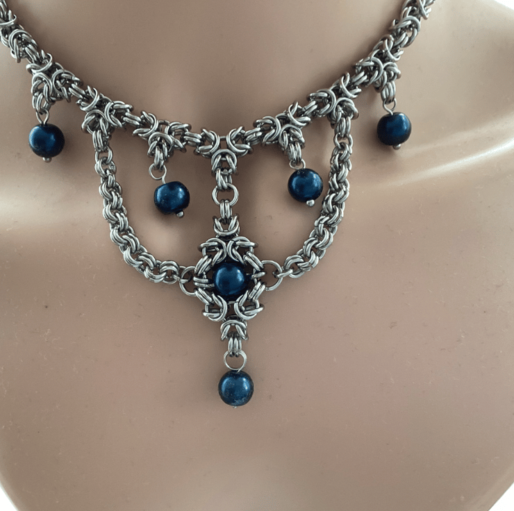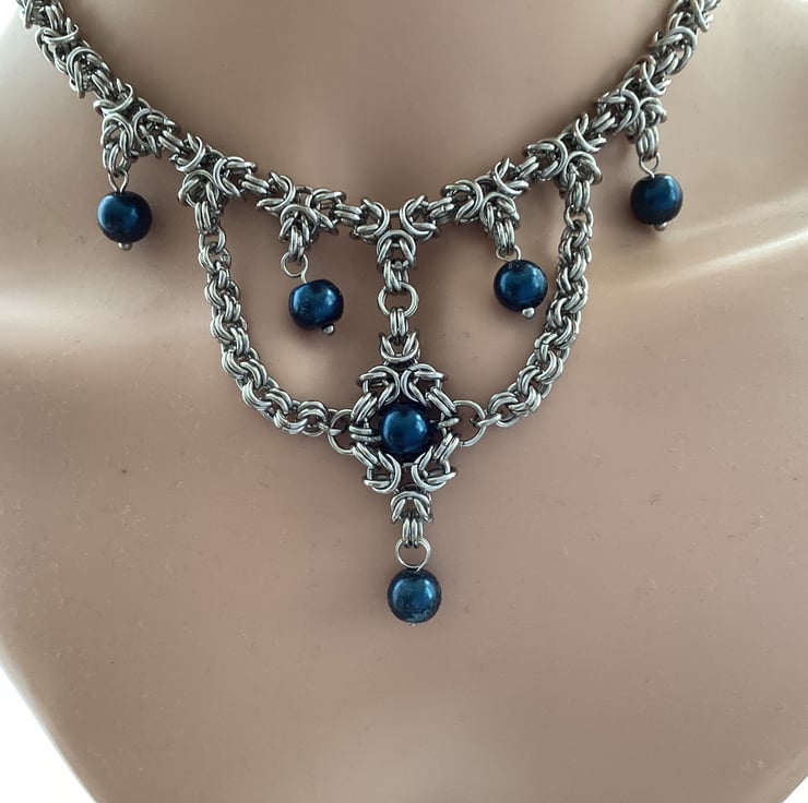 Vibrant Statement Necklace - Chainmaille beaded necklace - created with Dark blue shell pearls hanging from stainless steel in a byzantine droppers.