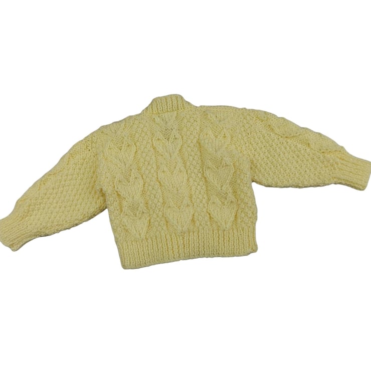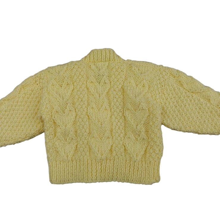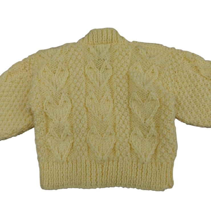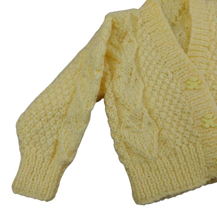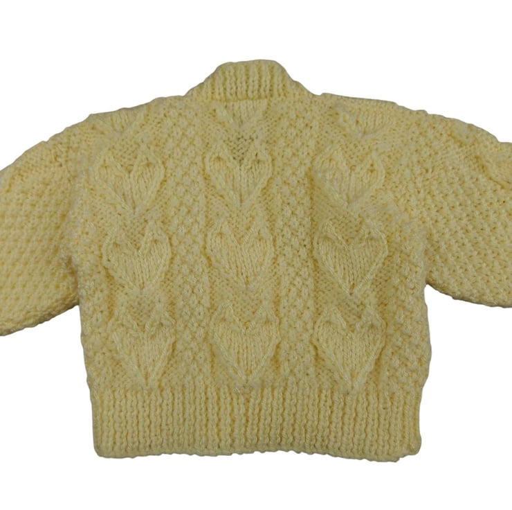Charming lemon baby cardigan, designed for little ones aged 0-3 months. This delightful piece showcases a textured heart pattern on the front, back, and sleeves, complemented by a cosy V neckline. The cute lemon teddy shaped buttons add the perfect finishing touch! Soft, stylish, and lovingly handmade, this cardigan is an ideal addition to any baby’s wardrobe. Get yours today and keep your baby warm and adorable!