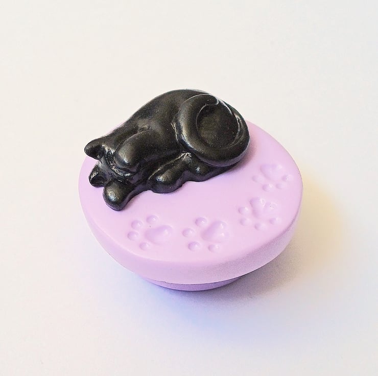 This cute sleeping black cat needle minder with purple paw print base will keep your needle safe whenever life interrupts your stitching.