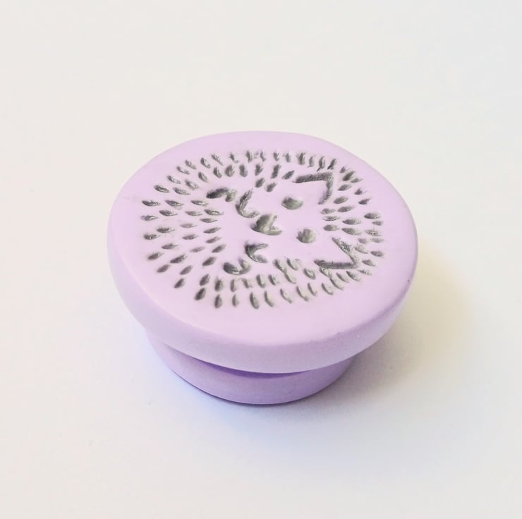 Handmade from polymer clay, this cute purple hedgehog needle minder will keep your needle safe whenever life interrupts your stitching.