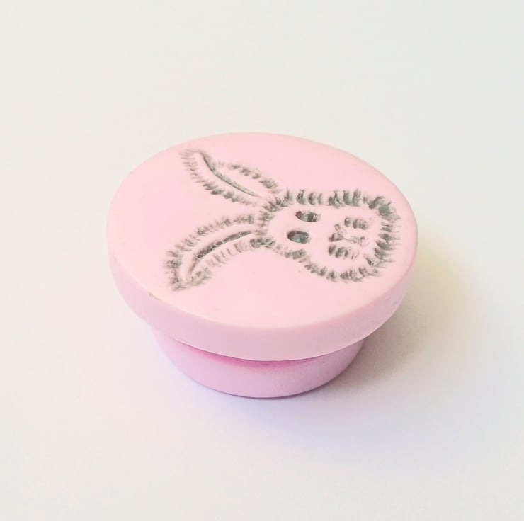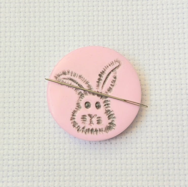 Handmade from polymer clay, this cute pink bunny rabbit needle minder will keep your needle safe whenever life interrupts your stitching.