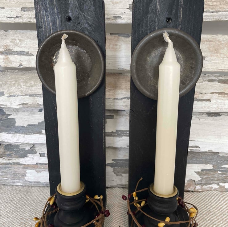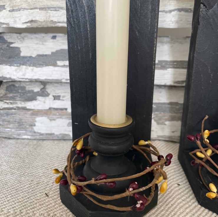 A lovely handmade pair of primitive wooden candle holders with tartlet tins to reflect the flame and finished with a pip garland