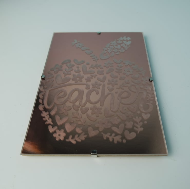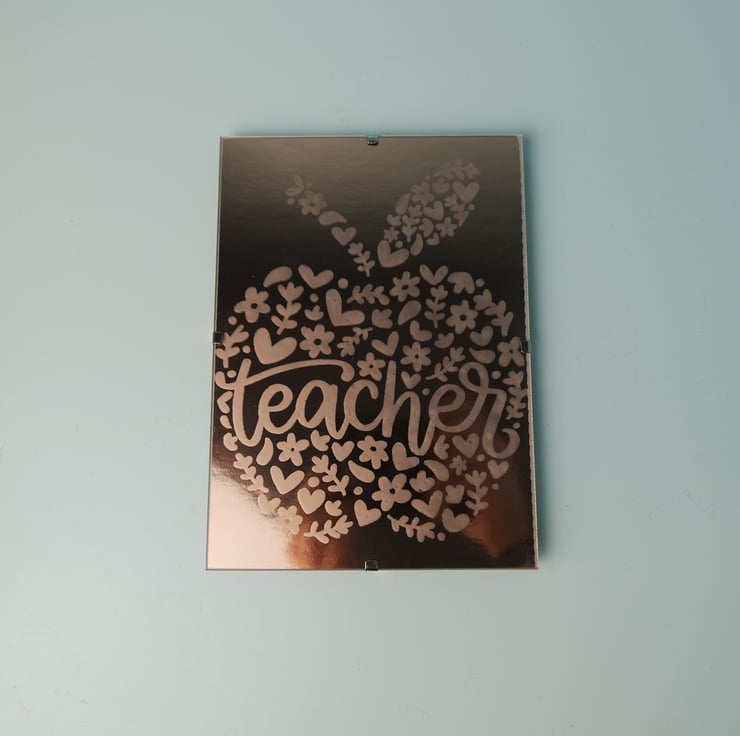 This glass front clip frame has been etched with a lovely flower, leaf and heart teacher pattern in the shape an apple complete with a rose gold card background to give it a mirrored effect.
