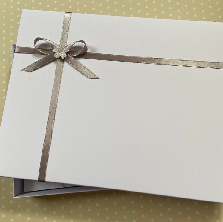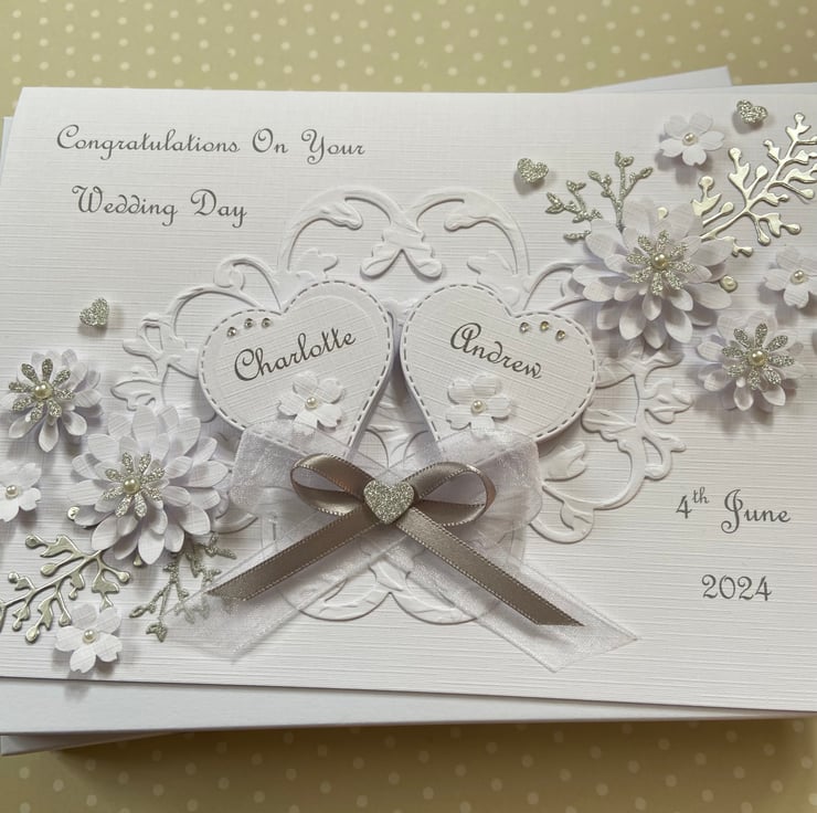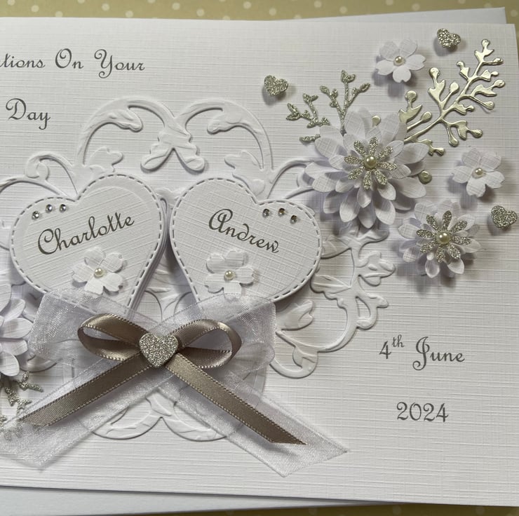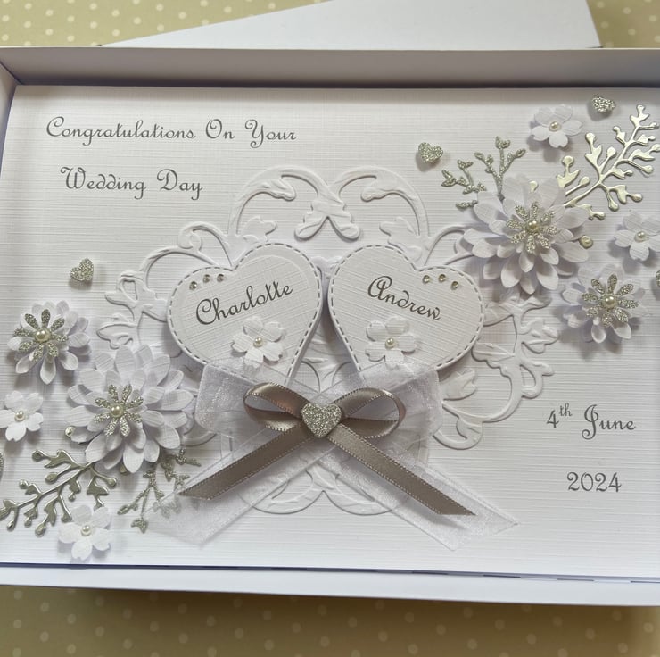 This handmade card is A5 in size (210mm x 150mm) on 300gsm heavyweight linen cardstock and can be for a wedding, engagement, anniversary or any other special occasion for a couple. This white and silver hearts card is decorated with ribbons and gems. I make each card to order and they can be personalised inside as well as on the front of the card.