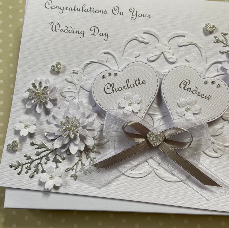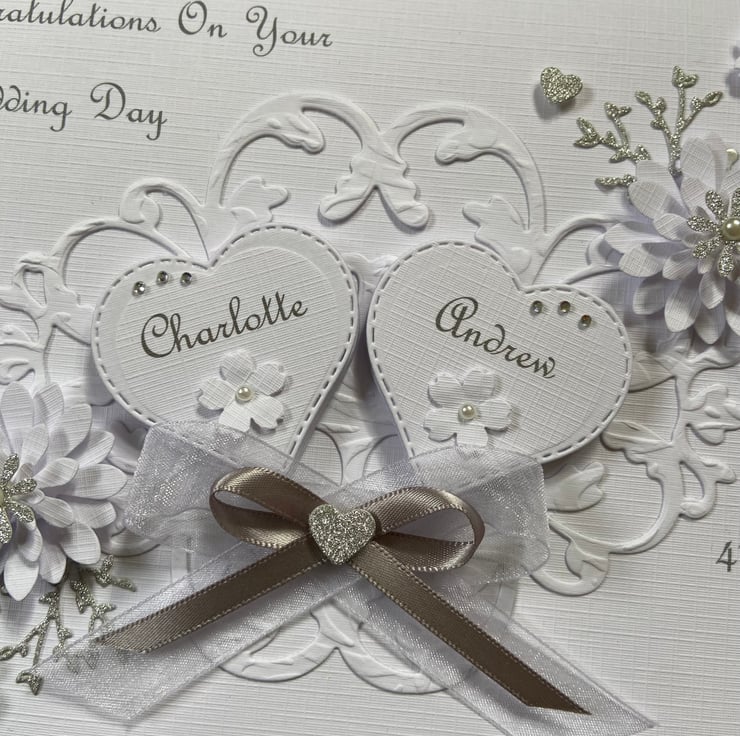 This card is personalised with the names of the couple in the hearts, along with the date of the special occasion.