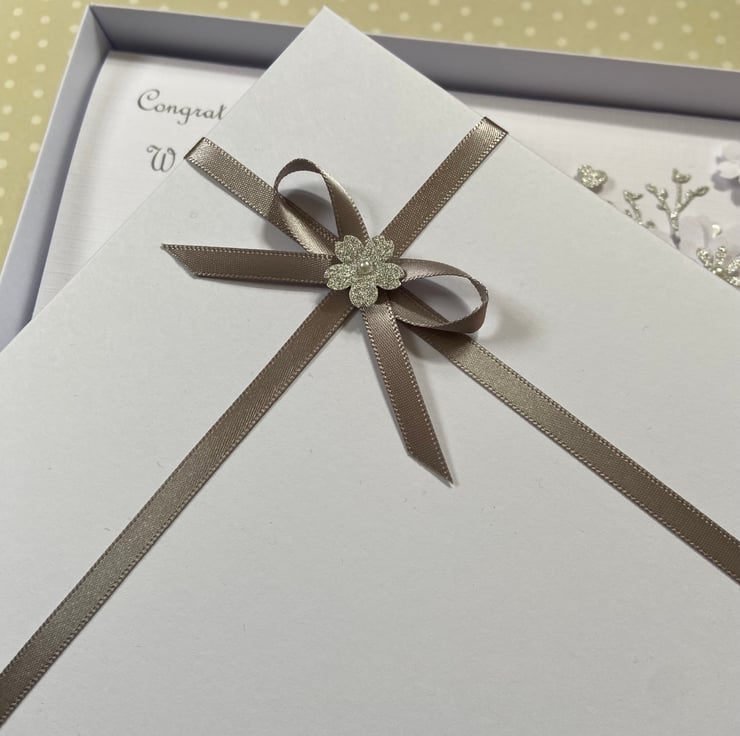 The card comes in a matching embellished gift box, as shown in the photographs.