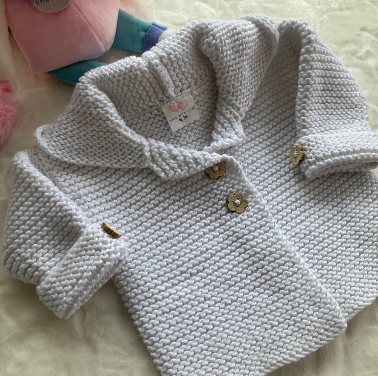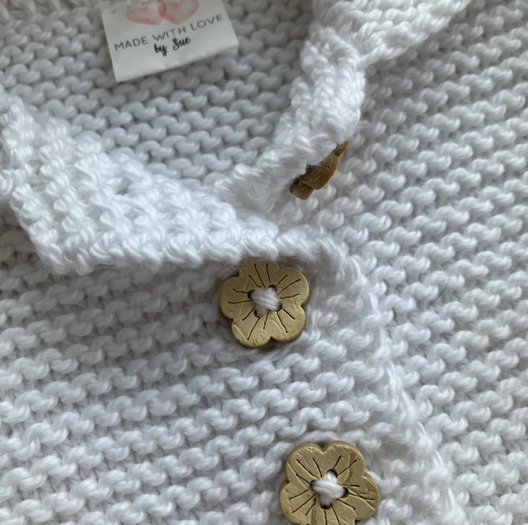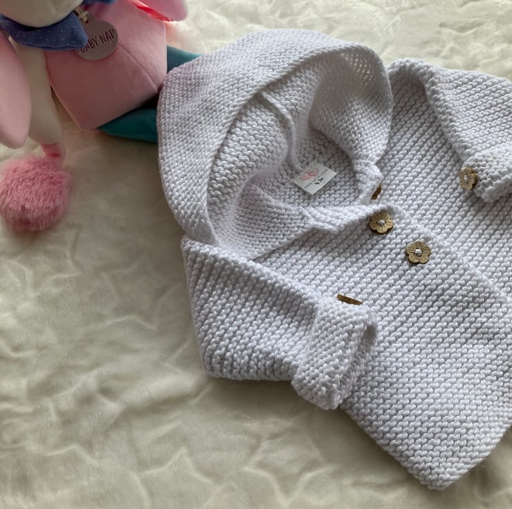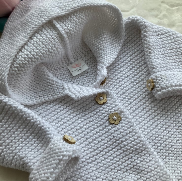 Hand-knitted baby girl’s hoody to fit from 0-3 months. I have knitted this cute little hoody in a super soft white cotton yarn and finished it off with flower-shaped carved coconut shell buttons on the front fastenings and cuffs. Perfect for keeping your little one snuggly and warm on cooler days. There are also booties to match and will make a great baby shower gift.