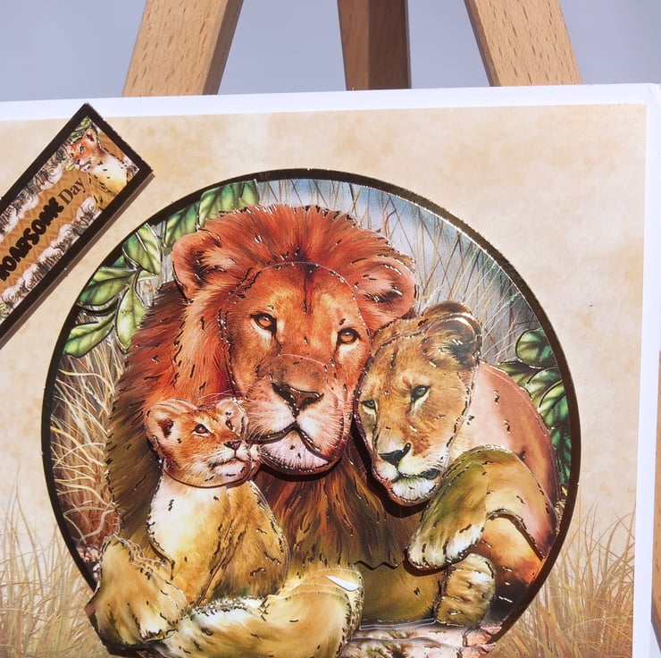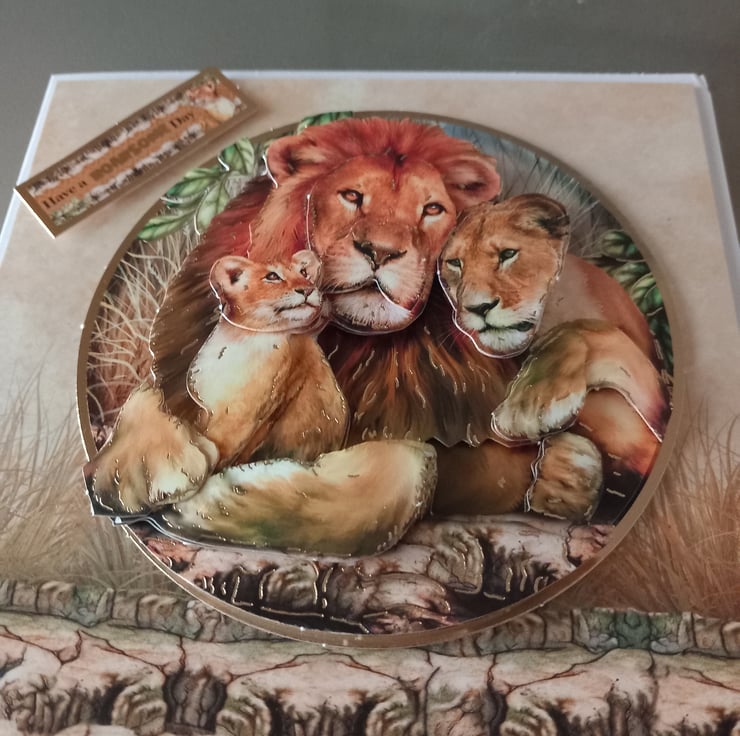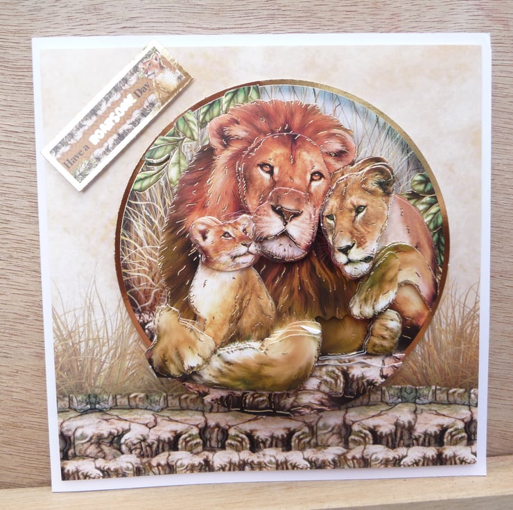 This card is a lion, lioness and a cub which has been decoupaged on to co-ordinating background card.then layered on to base card. This card measures 6 x 6 inches and the inside has been left blank for your own message.