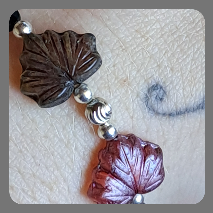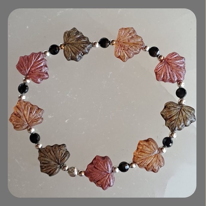 Pretty bracelet made with coloured Czech glass leaves, Black Spinel and sterling silver.