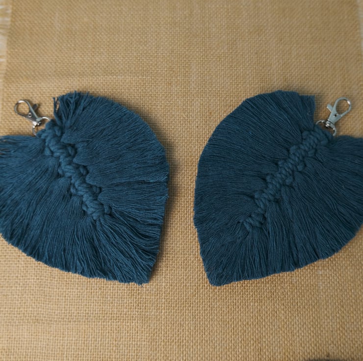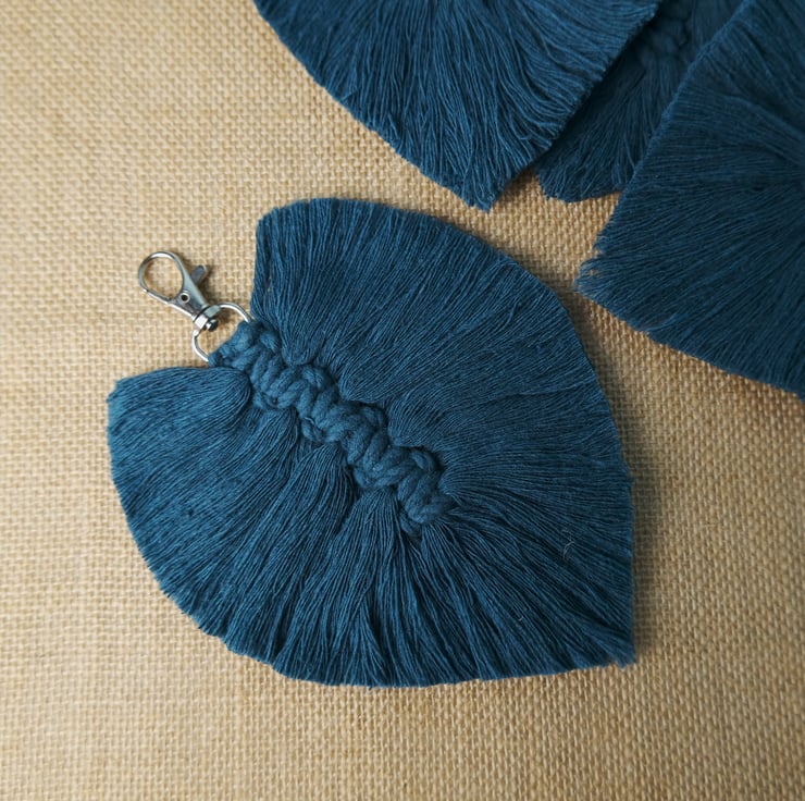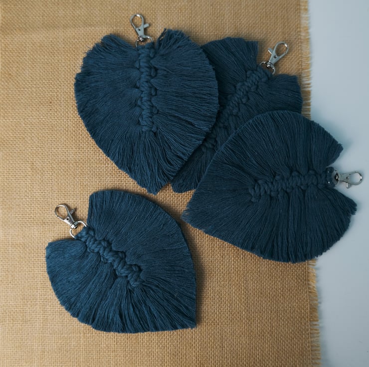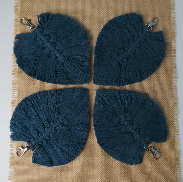 Each leaf has been hand cut so may vary slightly in size to each other. Size approximately 14cm width by 17cm height total (including keyring). Slightly larger than our green macramé leaf keyrings, this would also be a great addition as a bag accessory or can even be hung up around the home.