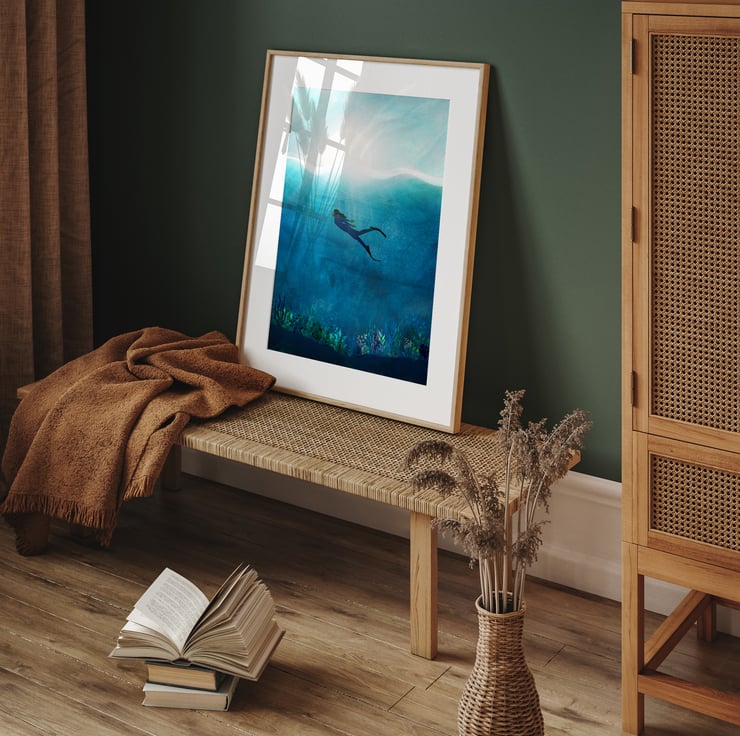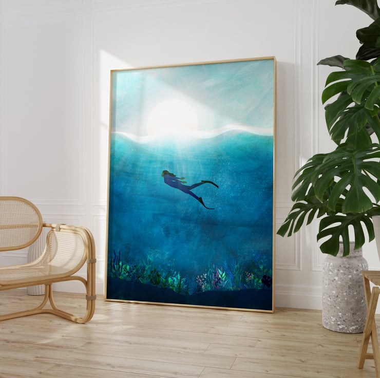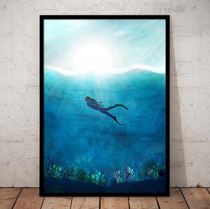 This wild swimming print is a reproduction of my original mixed media artwork created using watercolours, stencilling and photography which has been collaged and digitally tweaked to bring together the final composition.