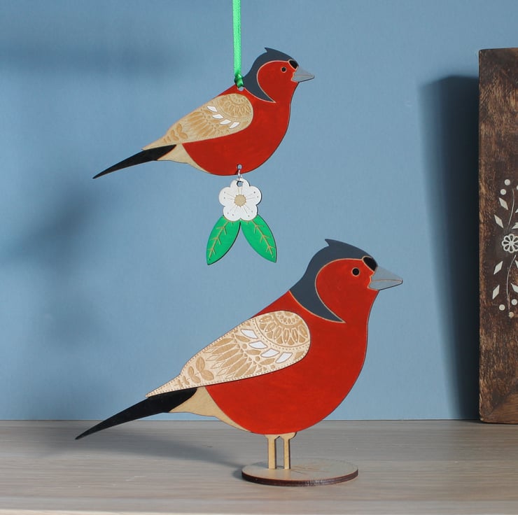 He's cut and etched from 3mm birch ply and has been hand painted with rusty red, grey and white details. He also has a little hawthorn flower with leaves, which hangs below him.