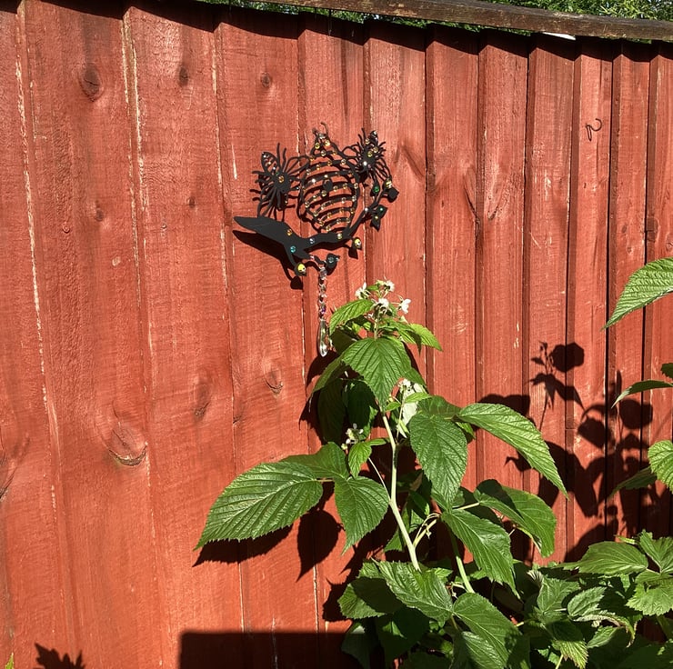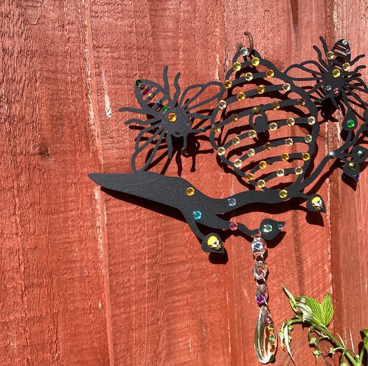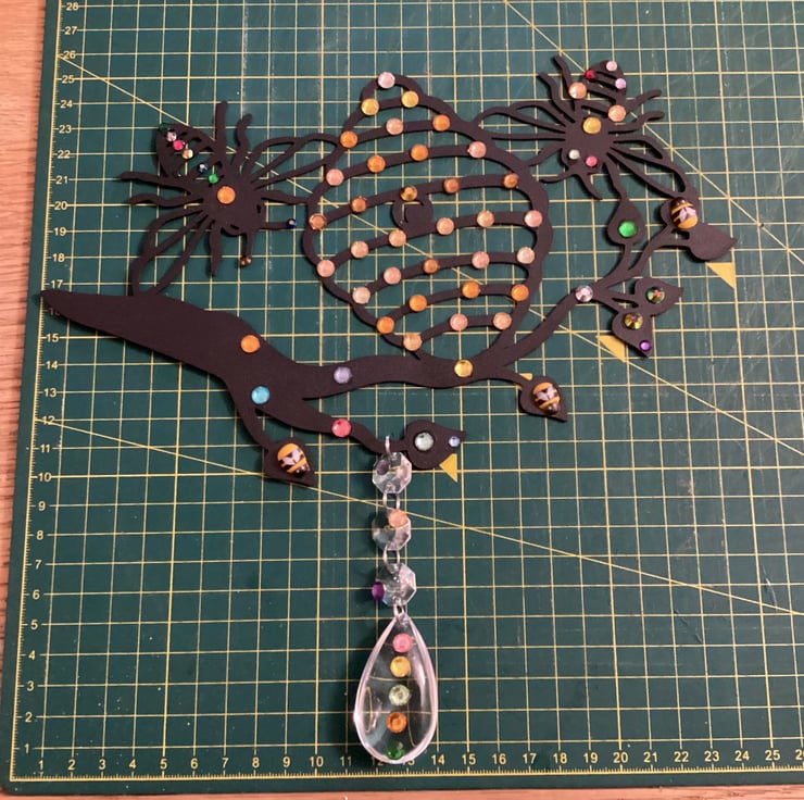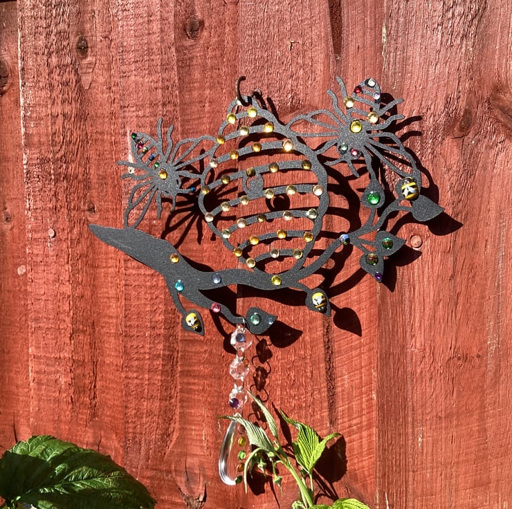 To make it I’ve used metal Bee garden decoration, embellished it with rhinestones diamanté in different colours and sizes. I’ve attached crystal pendant . Make a great sun catchers in the garden.
