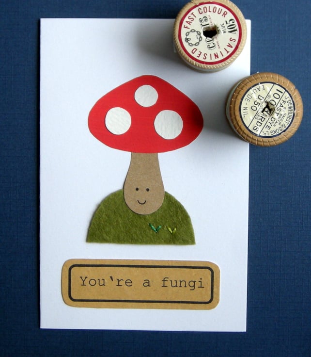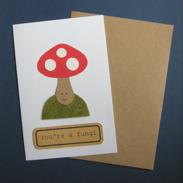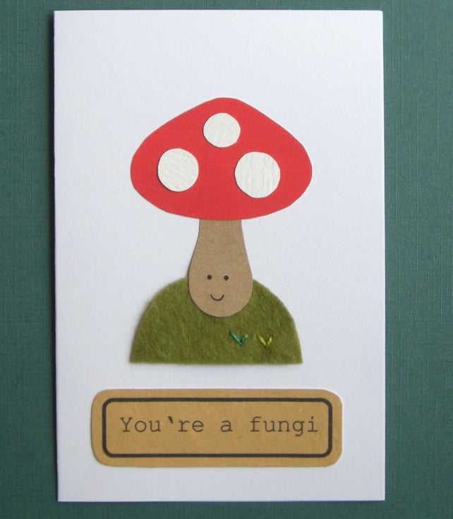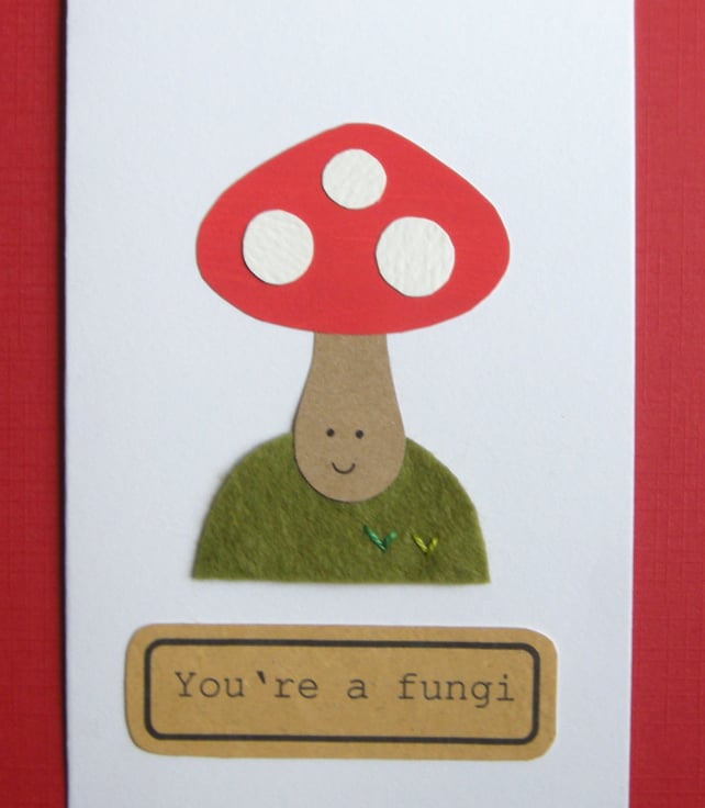 This handmade father's day card has been made from hand cut felt, painted card and recycled card. the top of the mushroom is red painted paper with white textured dots, and the stem is cut from recycled brown card and has a hand drawn face. The mushroom sits on a piece of felt with hand sewn stitches for the grass. The message on the card is printed on to recycled brown card.