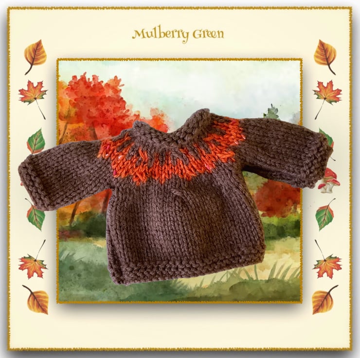 A lovely donkey brown jumper with an orange patterned yoke, to fit the Mulberry Green characters. The jumper is hand knitted and fastens with a little popper at the back.