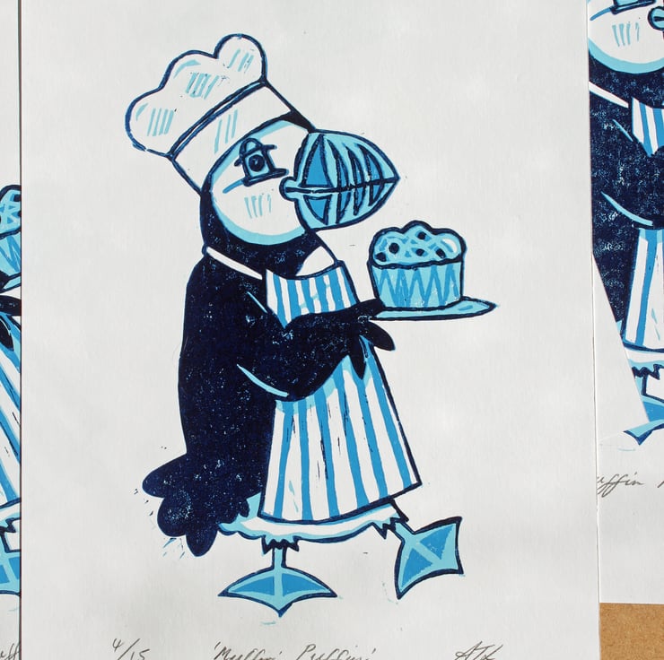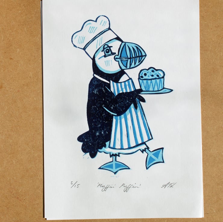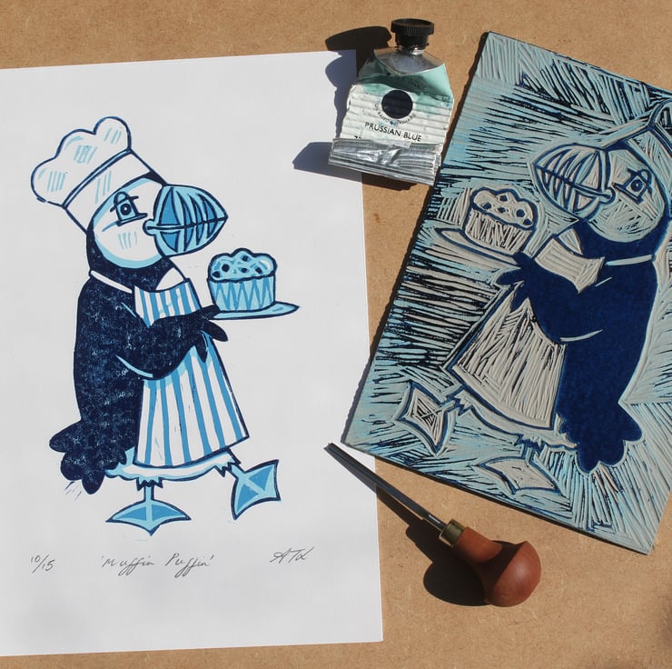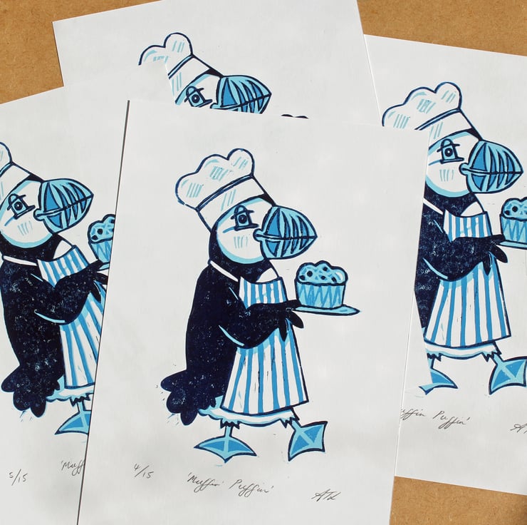 This is one of a series of puffin lino-cuts I have made over the last year. I love birds particularly puffins and herons.