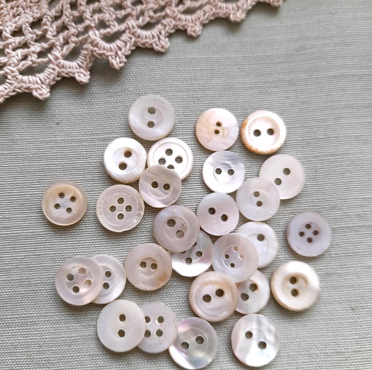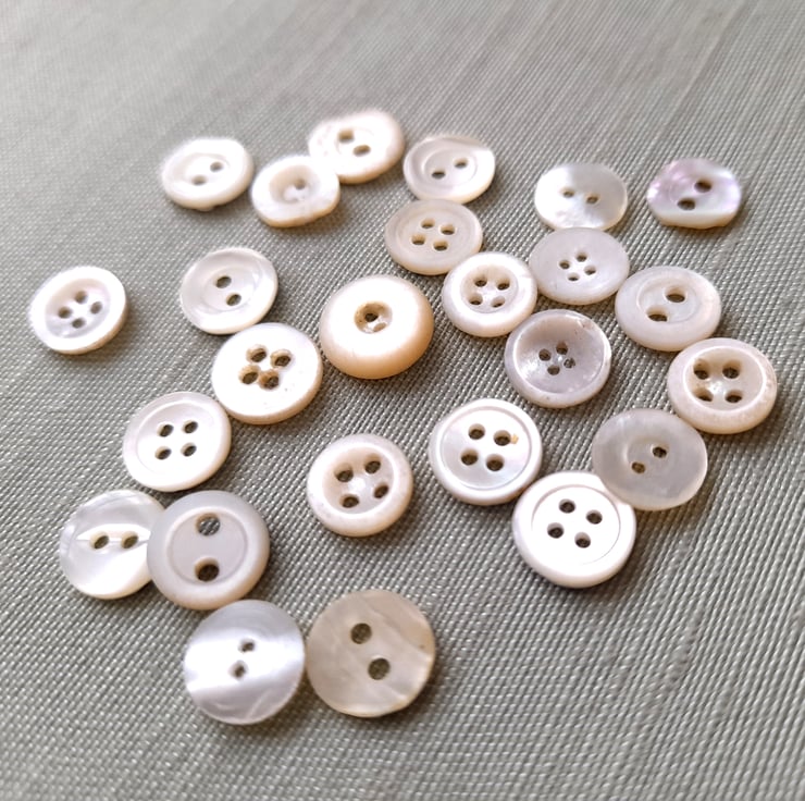 Vintage natural shell buttons 10-10.5mm in diameter, in an assortment of designs - some with 2 holes, some with 4 holes, and packed in a set of 25 (with a couple of spares in case any are chipped). I have had these in my collection for a number of years and therefore, they are very old - at a guess (and in comparison with some other buttons) I would say 1930's-1960's. Colours are generally off-white. Some might have a pearlier shell shine than others, and this is because they are vintage, so please expect some wear.