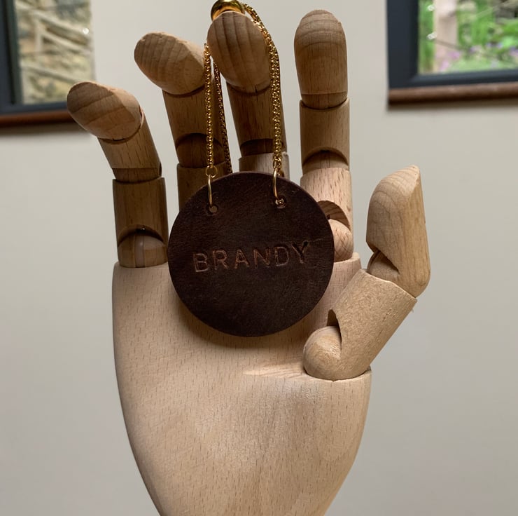 This fun little “brandy” leather disc will elevate a special bottle or decanter.