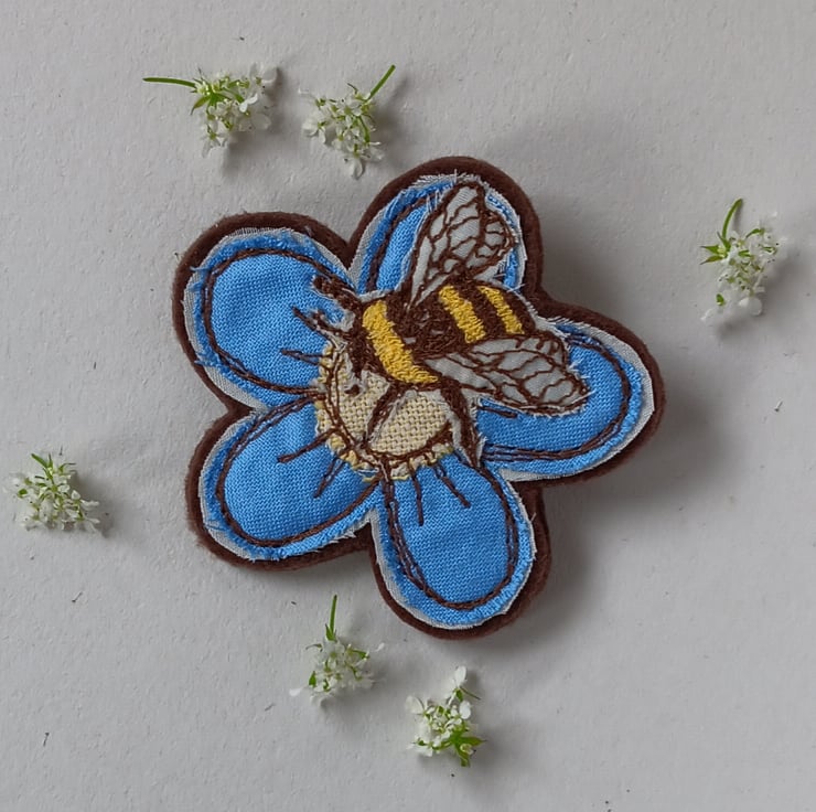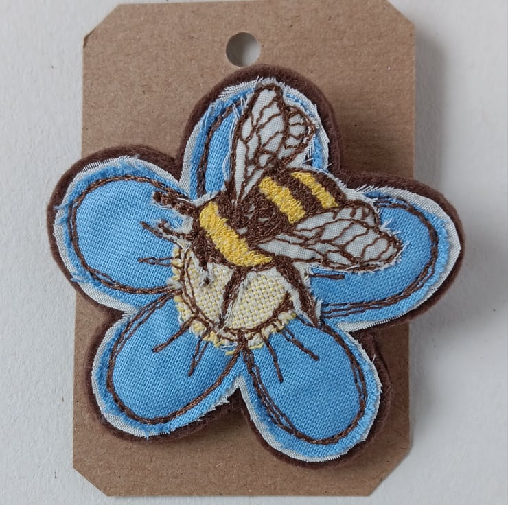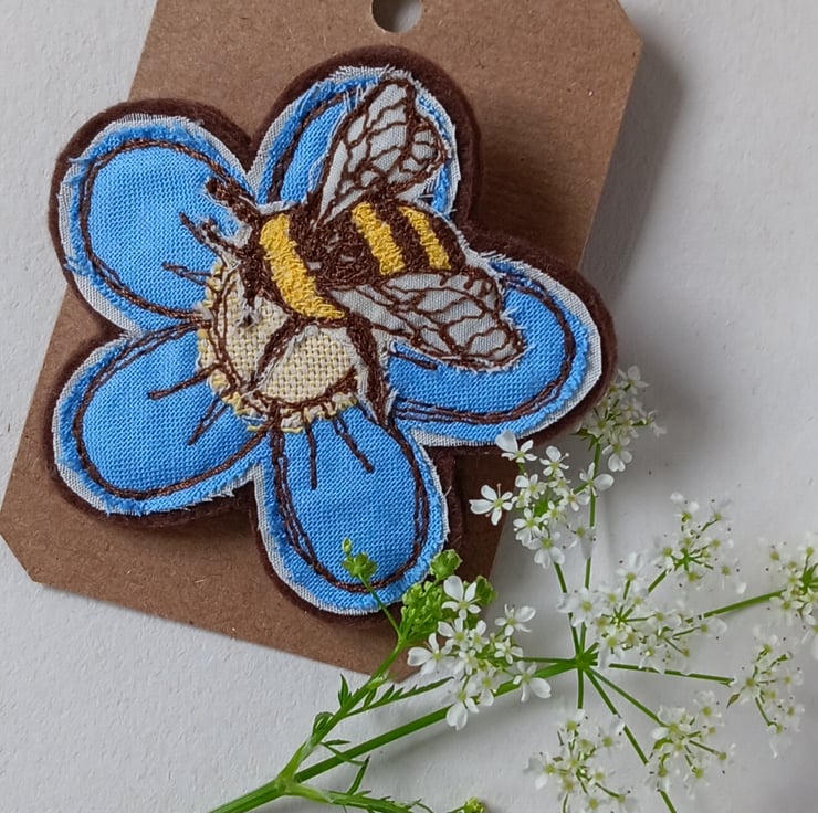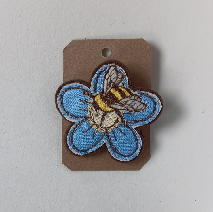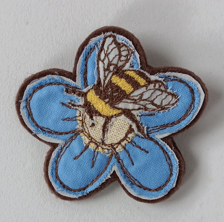 A lovely embroidered brooch, perfect for adorning any lapel or bag. The bee and flower are each sewn separately using free motion embroidery, then sewn together on to two layers of brown felt, then a brooch pin is added. The bumblebee is very detailed, whilst the flower is a simple design to make the bee stand out.