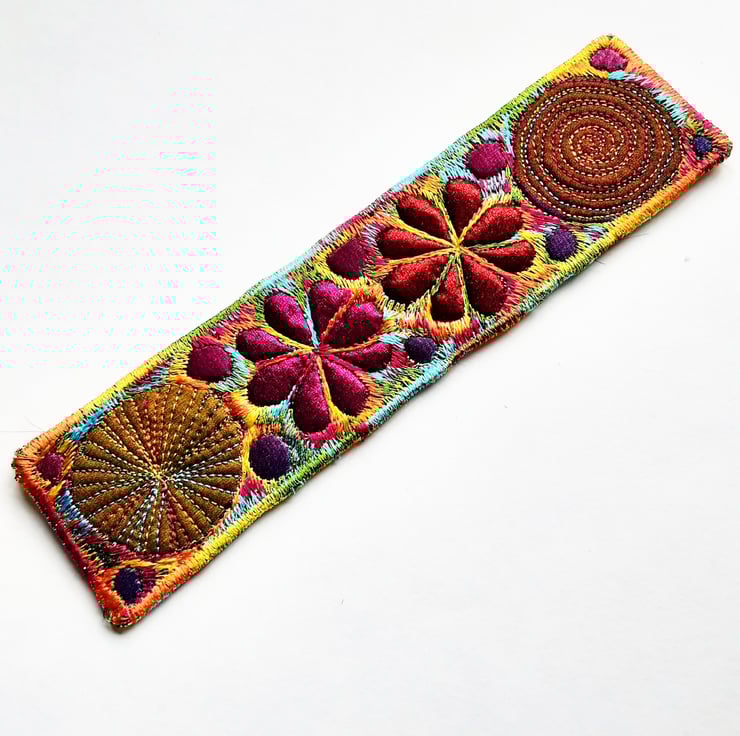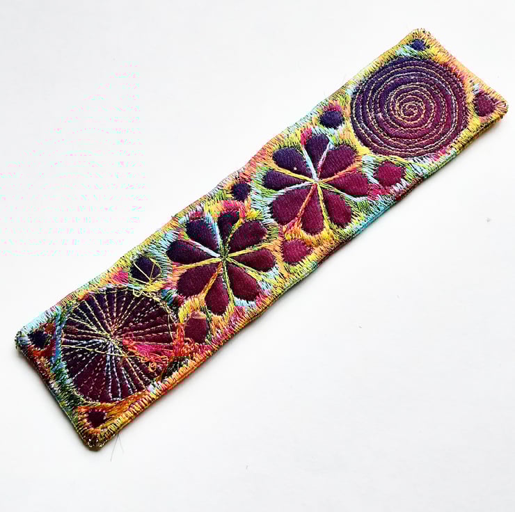 Made from layers of fabric including hand dyed Egyptian cotton and silk fabrics using the free machine embroidery style of sewing