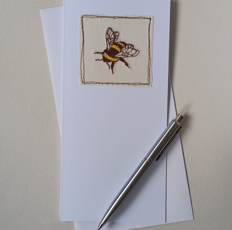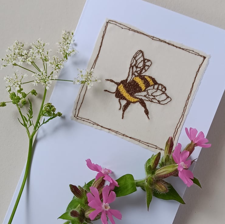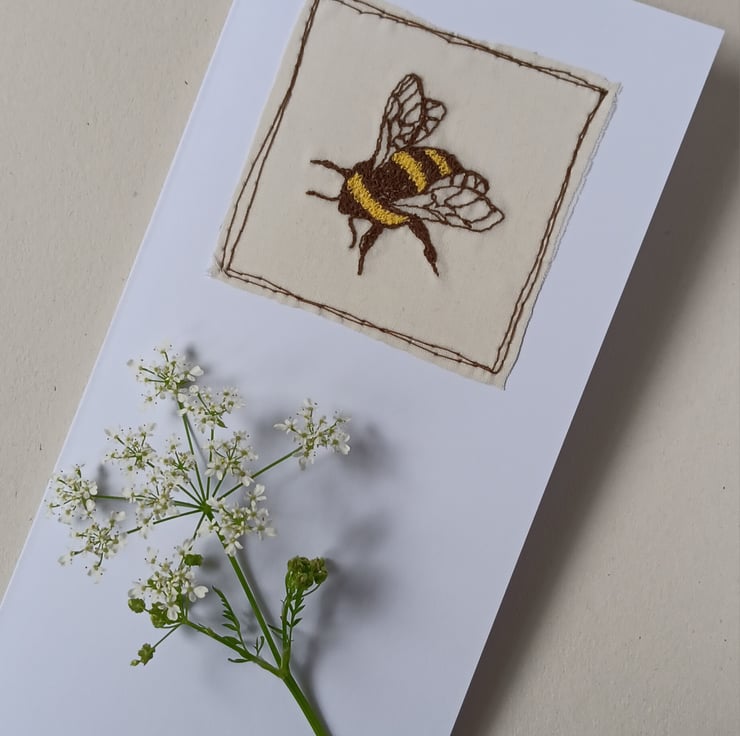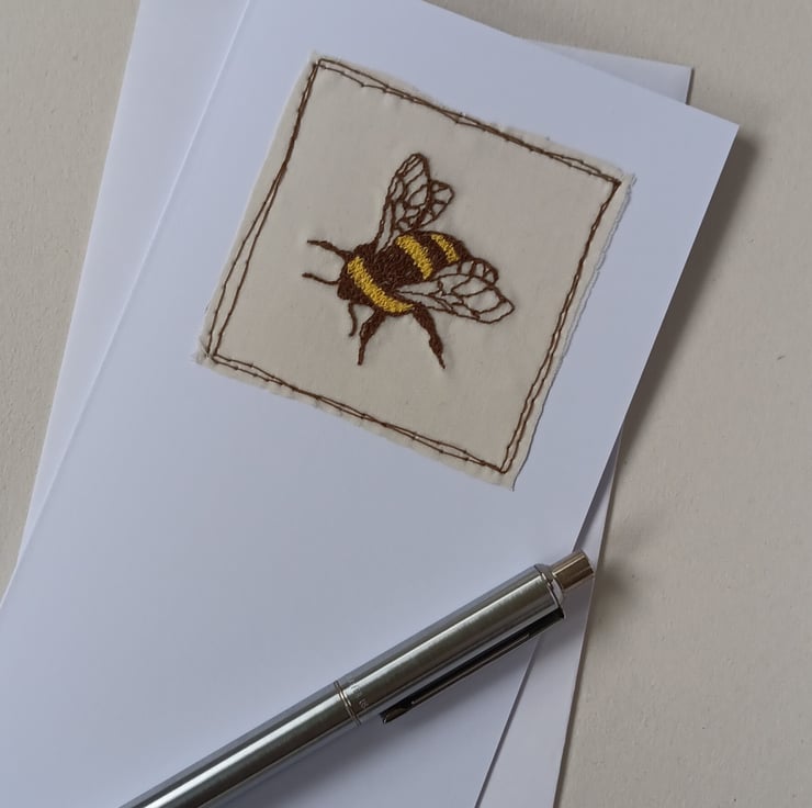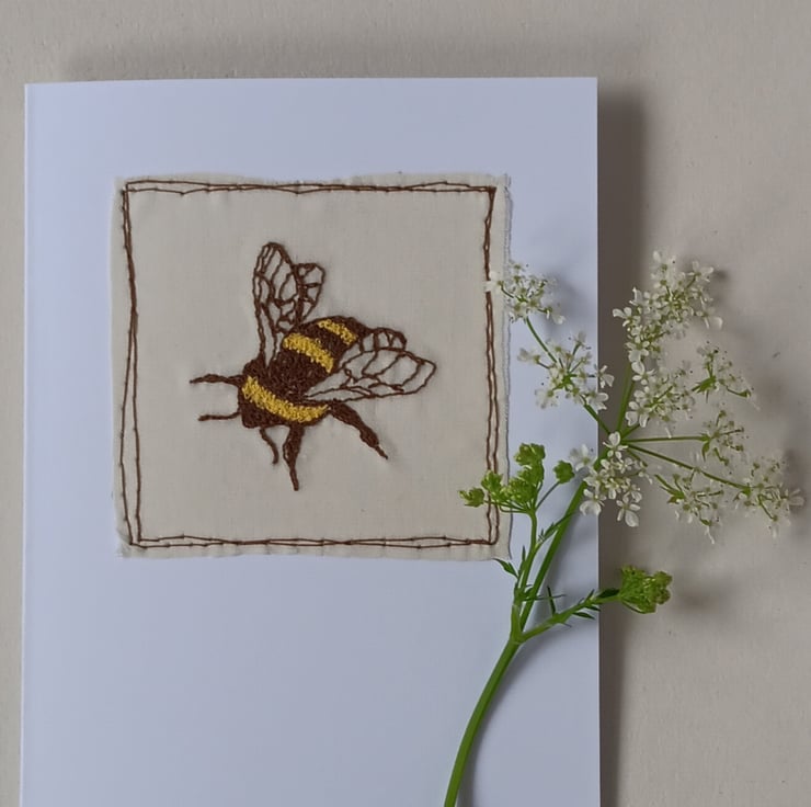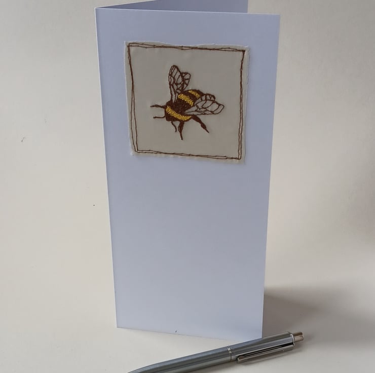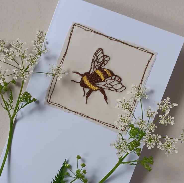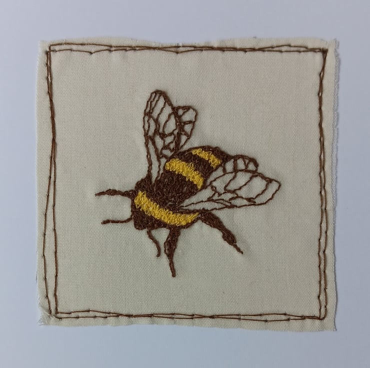 A detailed embroidery of a bumblebee, sewn using free motion embroidery. Perfect for any occasion, especially for a bee lover or nature lover.