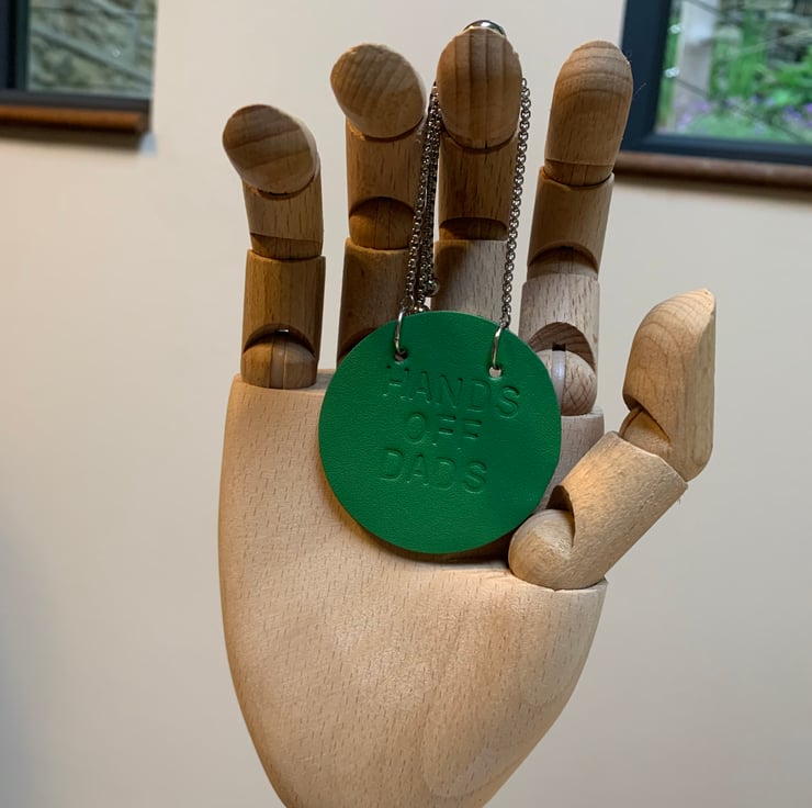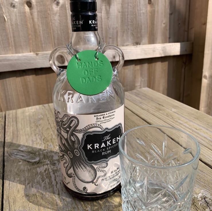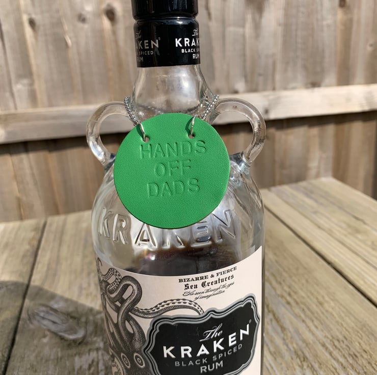 This fun little "hands off Dads" leather disc will elevate a special bottle or decanter.