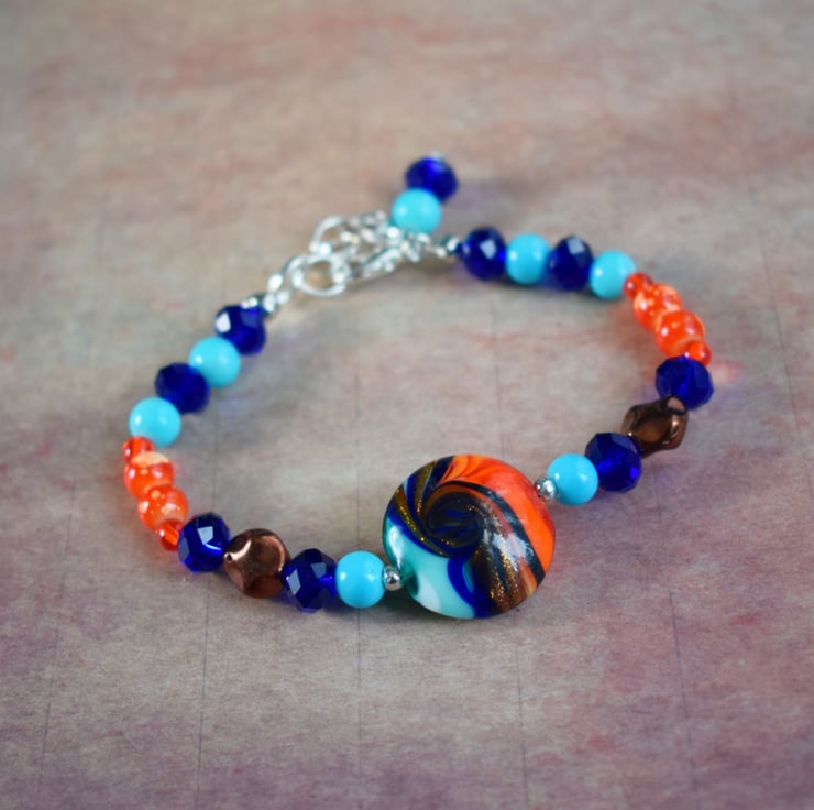 This pretty multicoloured bracelet started with this beautiful lampwork glass focal bead with its shades of blue, orange and glittery bronzey brown. It sits right at the centre and the rest of the bracelet is made with glass beads to echo these colours, some faceted, some smooth but all continuing the colours of that great central lentil shaped bead.