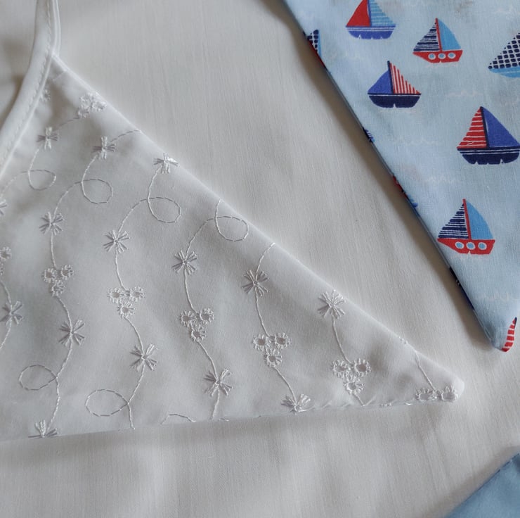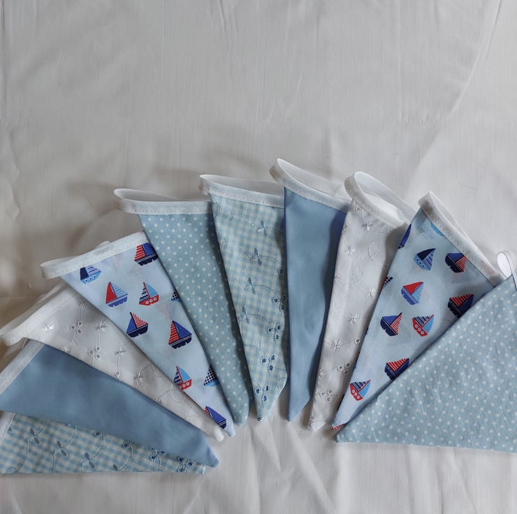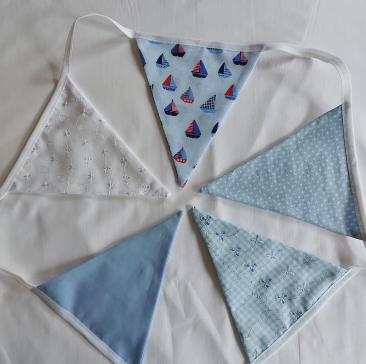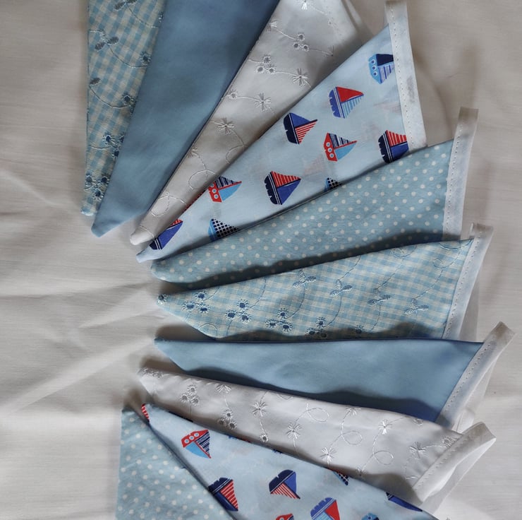 Handmade bunting using a mixture of polycotton, cotton and broderie anglaise fabric. Each flag measures 16cm x 20cm, ten flags in total, 3.5 metres in length and stitched to a white bias tape. Extra tape at either end for tying