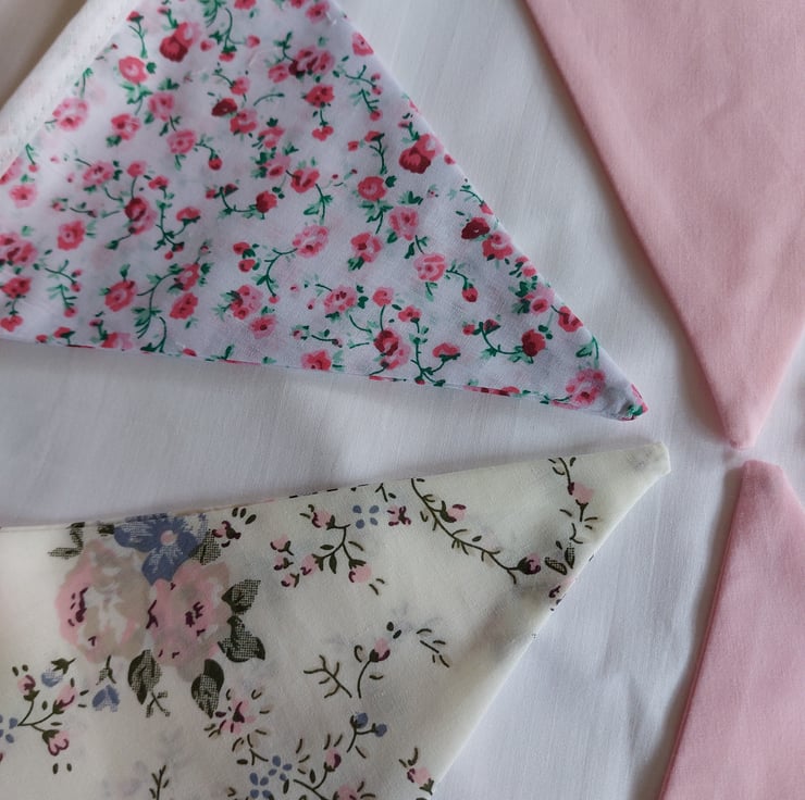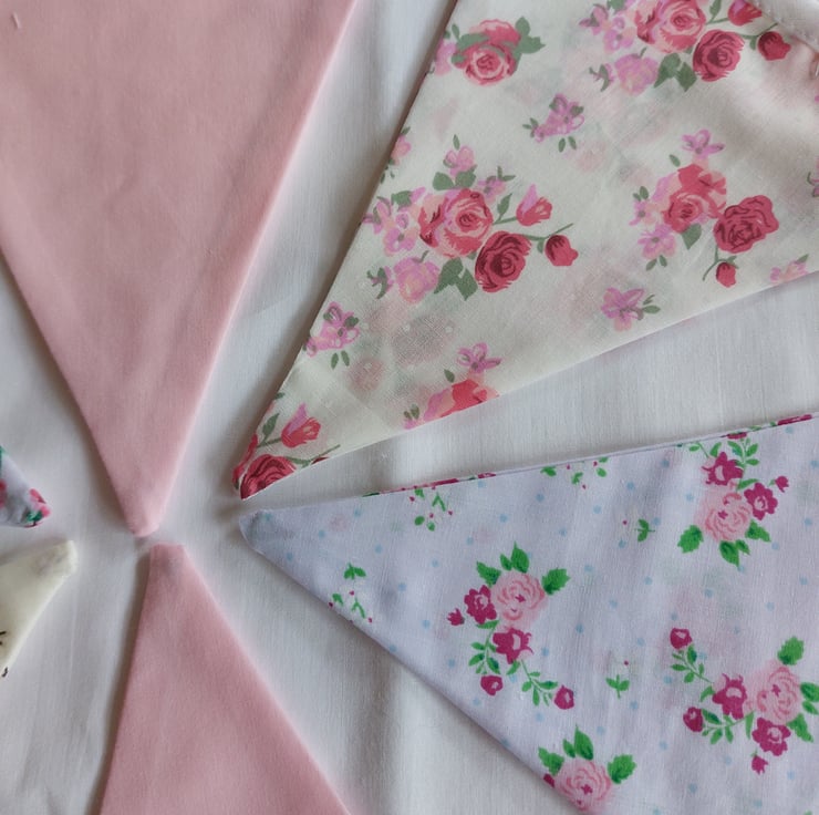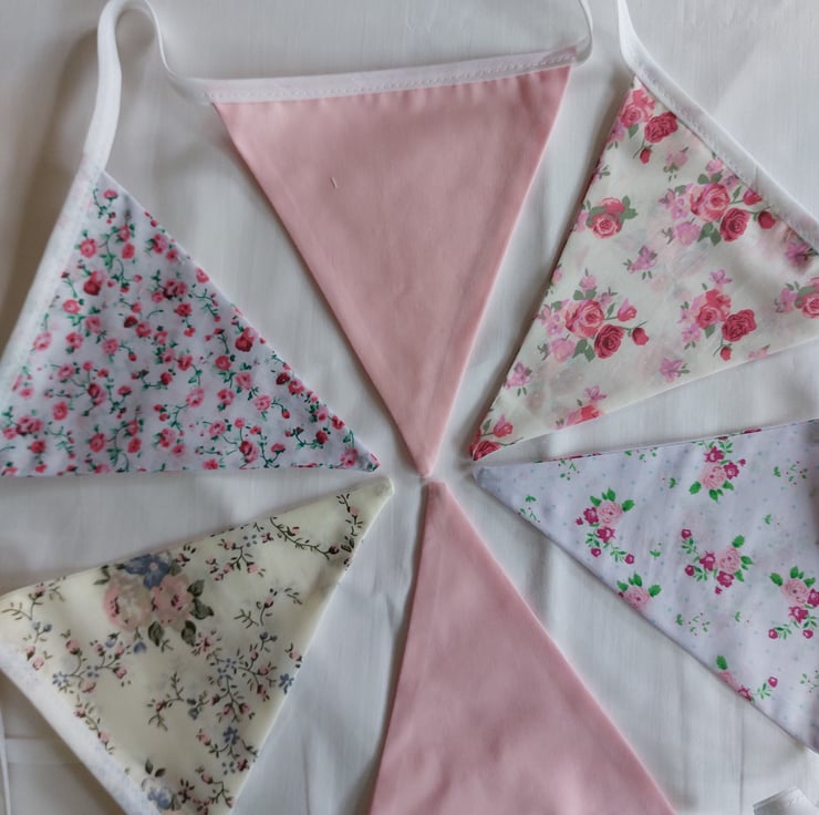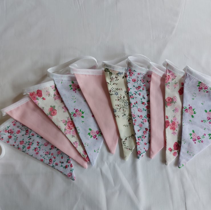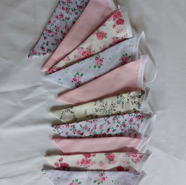 Handmade bunting using polycotton fabrics in various florals and pinks. Each flag measures 16cm x 20cm, ten flags in total, 3.5 metres in length and stitched to a white bias tape. Extra tape at either end for tying