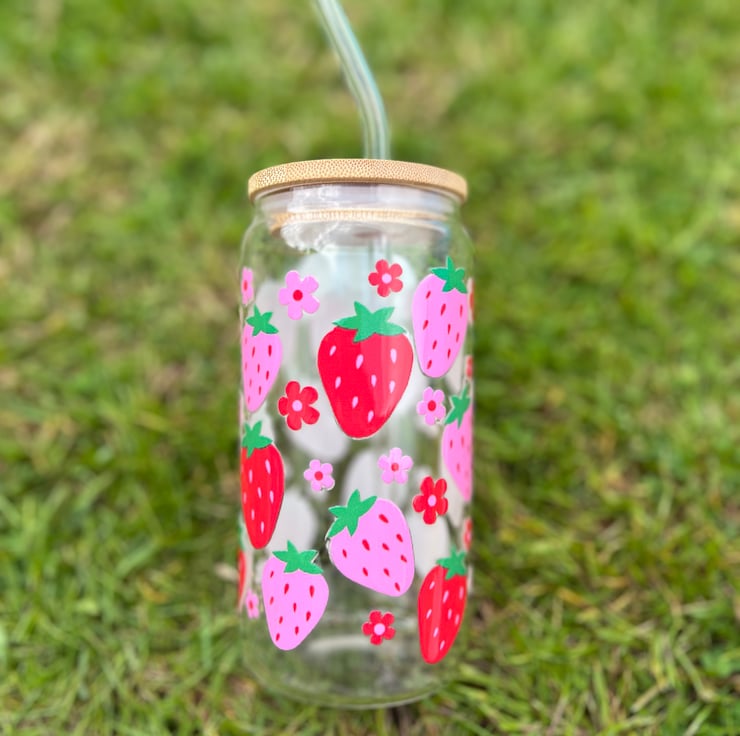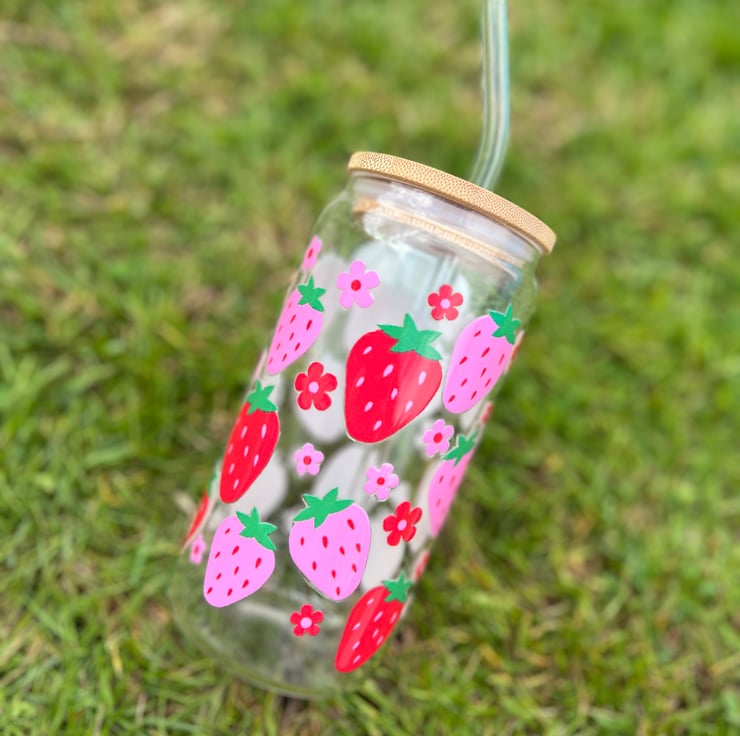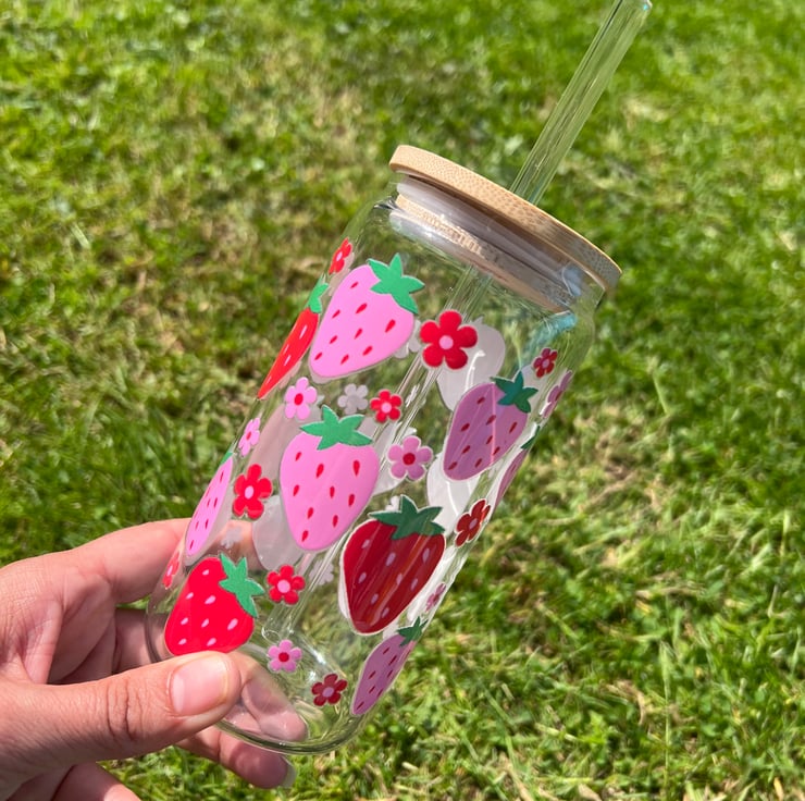 Introducing this stunning 16oz Handmade Clear Glass Strawberry themed glass tumbler perfect for all occasions! This beautiful tumbler is designed with the theme of summer.