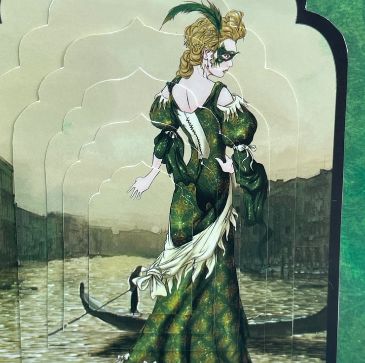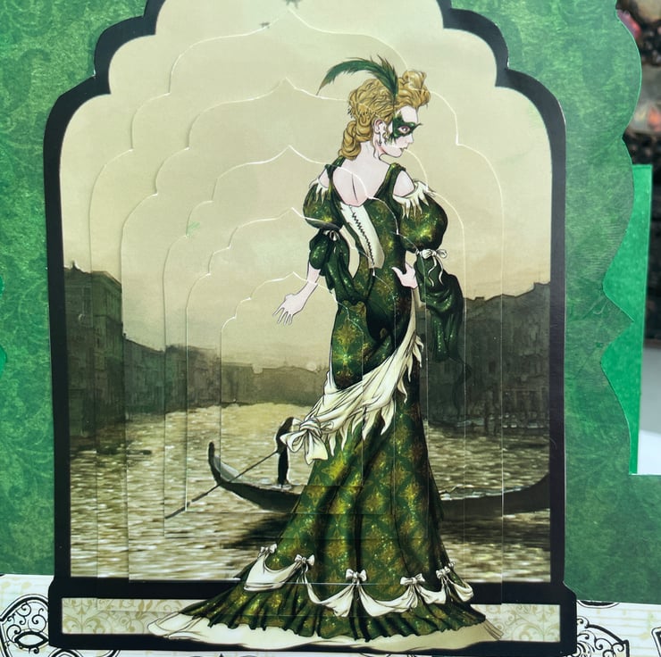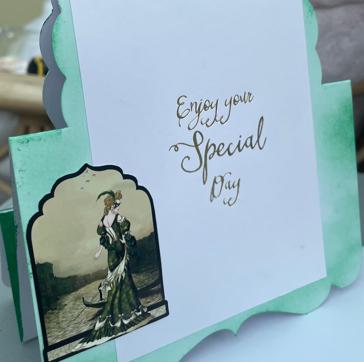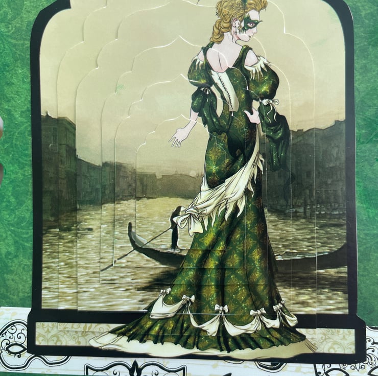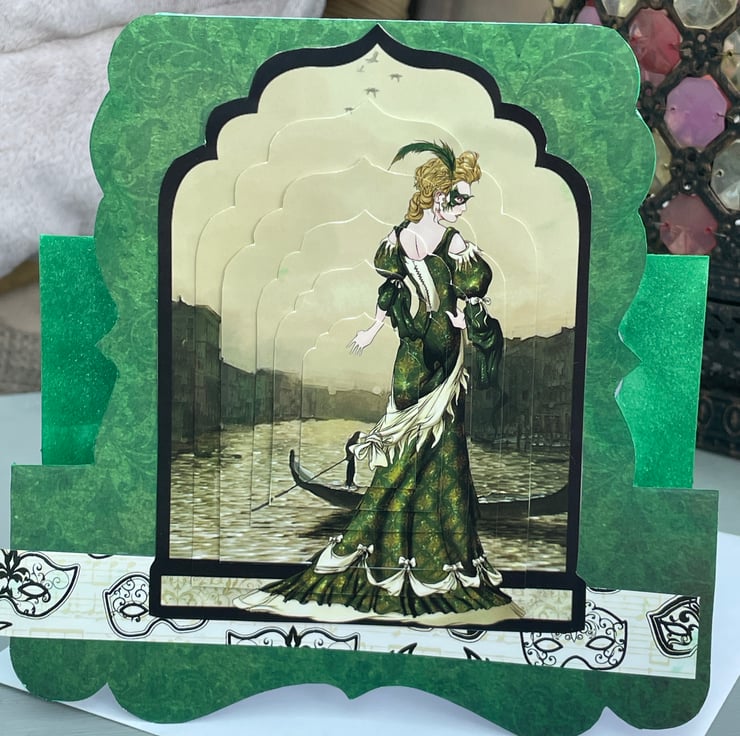 A Venetian beauty for a lovely celebration. This 15x15cm (very approximate as it is a shaped card) card features a fancy label shaped tent shaped card. It is a vision in green, the backing paper is an emerald green baroque style print. This is topped with a strip of cream card with Venetian masks printed on it. The main image is a layered design with a beautifully dressed lady, all in green, with a mask hiding her identity. She is standing next to a canal with a gondola in the background. She makes a mysterious and glamorous scene. The back of the card has the greeting Enjoy your special day in gold with a matching picture at the side. Excellent for a birthday or anniversary, whatever you want.
