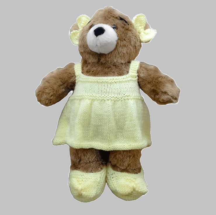 This hand knit PATTERN is for a dress for a Teddy. To fit Teddy height: 38 (43: 48) cm or 15 (17: 19) inches. The dress is knitted in double knitting yarn using 3.25 mm and 4 mm knitting needles and is knit flat and seamed.
