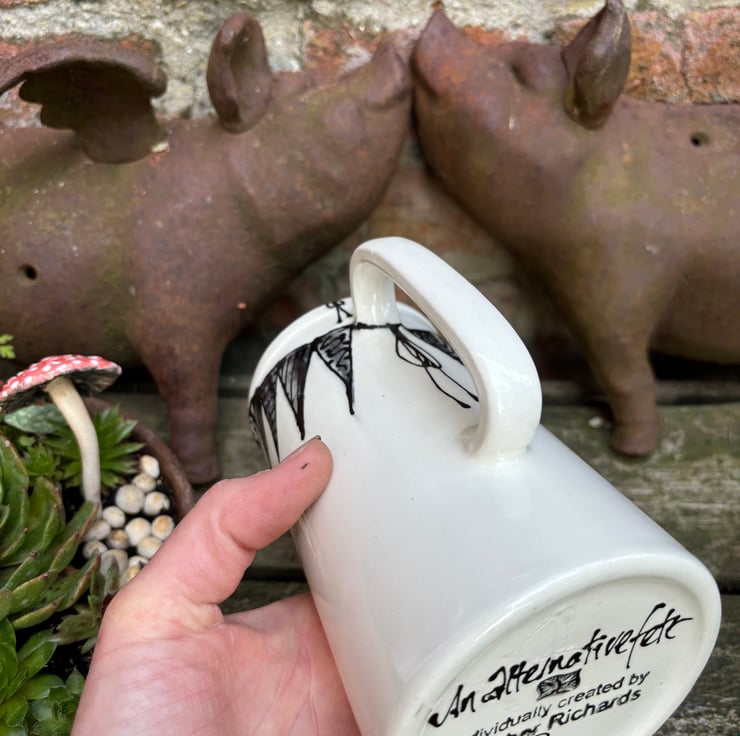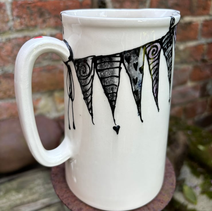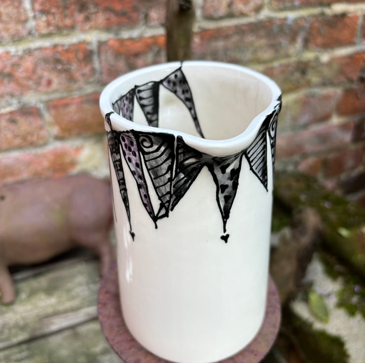 This is a hand cast high fired earthenware jug with an alternative bunting in mulchy blacks. The bunting loops over the rim of the jug and into the inside. I use food safe underglaze colours and lead-free glaze and fire to high earthenware temperatures.