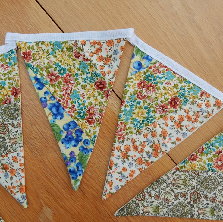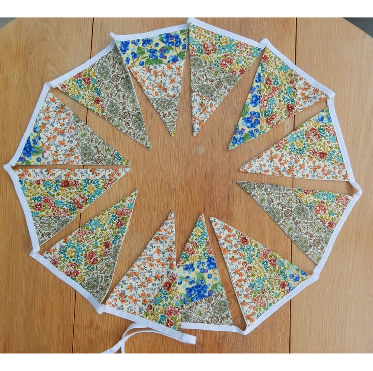 This pretty patchwork floral bunting has twelve flags made from a variety of good quality cotton fabrics. The flags have a plain cream fabric on the reverse, which gives a quality feel and helps the bunting hang well. The white tape measures 2.5 metres, with the distance between first and last flag being approx. 170cm. This gives a generous length of bunting, with ties at each end for hanging. Each of the 12 flags is 16cm (6.5 inches) deep.