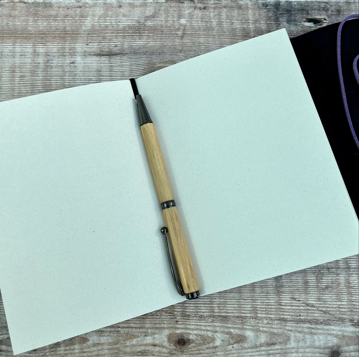 It is filled with 80 pages (160 sides) of high quality recycled paper, suitable for all writing and drawing mediums. It is tied with a light purple faux suede cord.