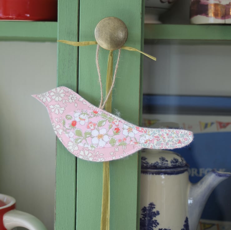 A set of three lightly padded birds made from a selection of Liberty Tana Lawn fabrics in shades of pale pink. They can be used as a hanging decoration, gift tag or simply to cheer up your favourite notice board or shelf.