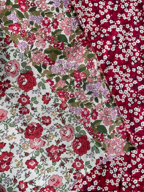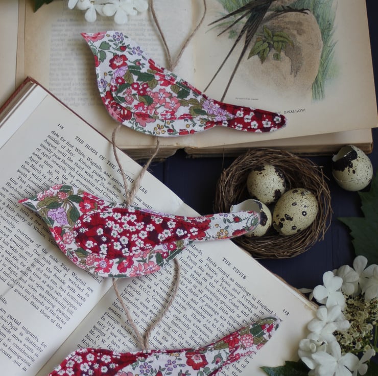A set of three lightly padded birds made from a selection of Liberty Tana Lawn fabrics in shades of red. They can be used as a hanging decoration, gift tag or simply to cheer up your favourite notice board or shelf.
