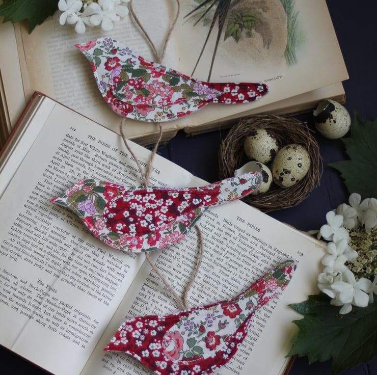 Each bird has been created from odds and ends of leftover fabric and measures approximately 14cm from beak to tail. Each one is double sided and made from three different co-ordinating patterns (Felicite, Mitsi Valeria and Hedgerow Ramble) which have been cut out by hand. They contain a layer of polyester wadding to create a padded effect and have a hanging loop made from garden twine.