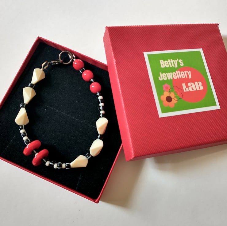 A bold bracelet, featuring cream upcycled, red and black and cream seed beads.