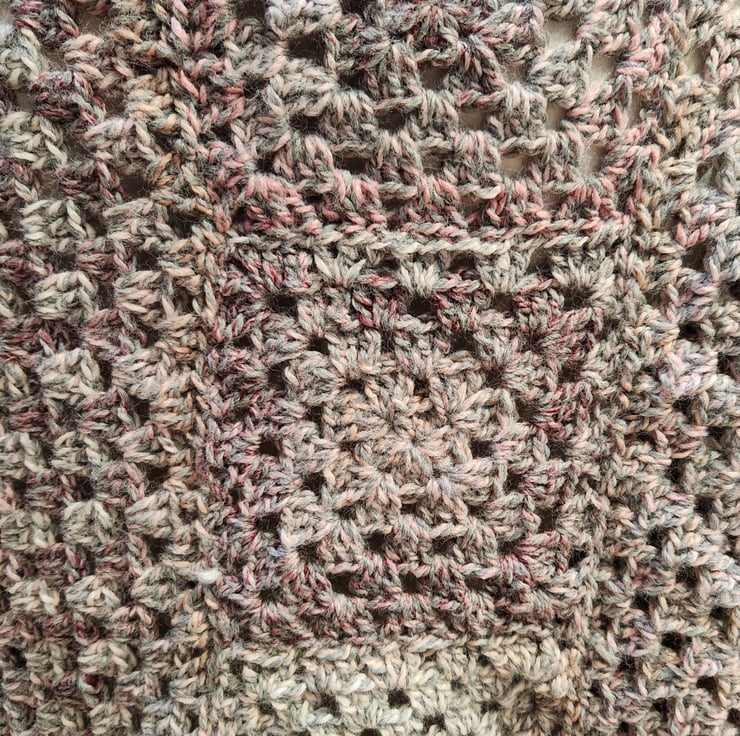 A hand made crochet cardigan in a grey beige pink mix acrylic yarn. This will fit a ladies size 12-14 approximately. Open front. Hand wash dry flat.