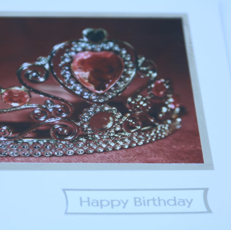Photograph of a pink & silver coloured tiara, photographed on a pink background. Photo backed with silver mirri board, Printed sentiment, edged in silver.